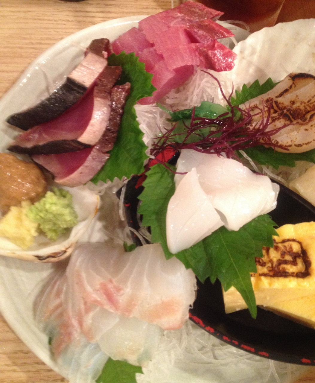 刺し盛りをオーダーすると、酢飯とのりのサービスがあり、手巻き寿司のようにして食べることができる。