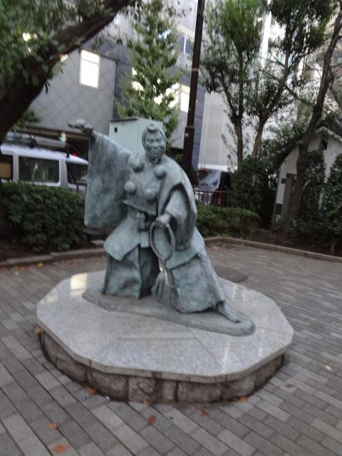 明治座の手前、浜町緑道の入口に建てられています。この辺りは、江戸幕府から興行特権が与えられた芝居小屋、江戸三座と称される三代歌舞伎場のうち二つ、中村座・市村座の芝居小屋があったそうです。昭和7年市村座が廃座になるまで、300年続いたそうです。歌舞伎発祥の地を記念して、有名な演目、勧進帳の弁慶像が建てられたそうです。