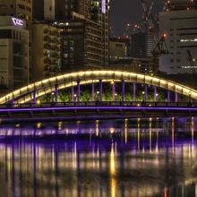 夜の堂島大橋は、ライトアップがされて大変綺麗です。後ろにある高層ビルとのコラボも大変いい感じです。全長は、76.15mで 幅 員が22.70m、 形 式がアーチ橋と成っています。周辺は中之島に走るランナーが以外に多くランに適した場所です。