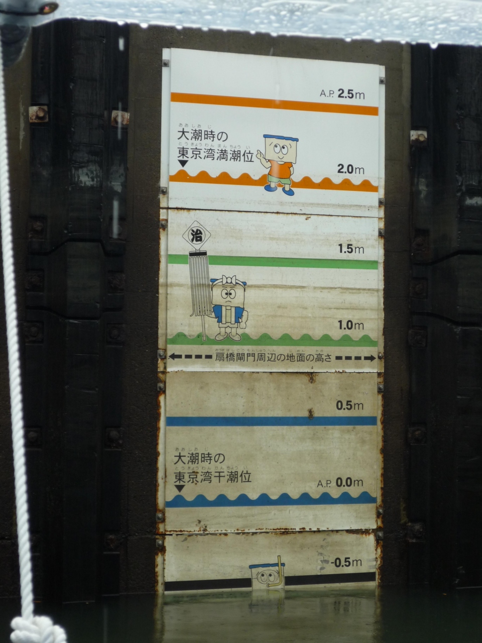東京の川をめぐる観光船で閘門を通りました.二つの川の水位の差で閘門内の水位を変えて行き来します.見る見る間に水位が上下して楽しいです.また,大きな鉄の扉(ロックゲート)が上下するさまも迫力がありました.