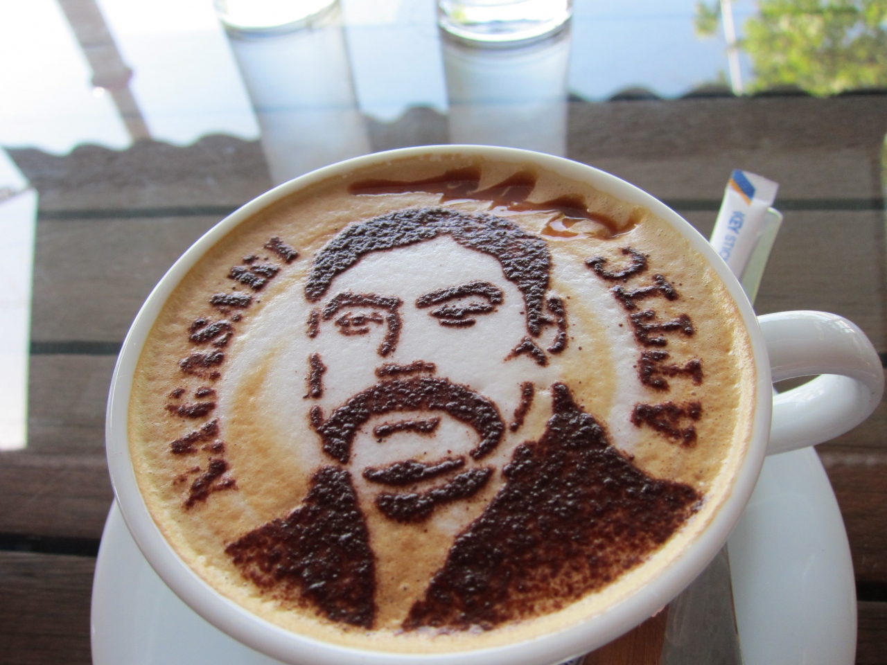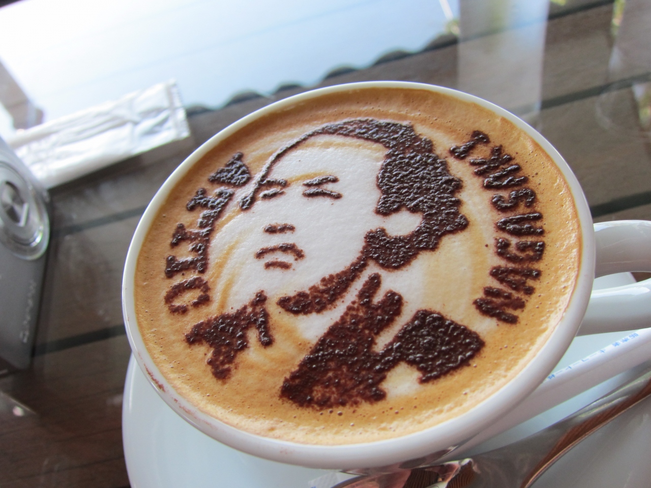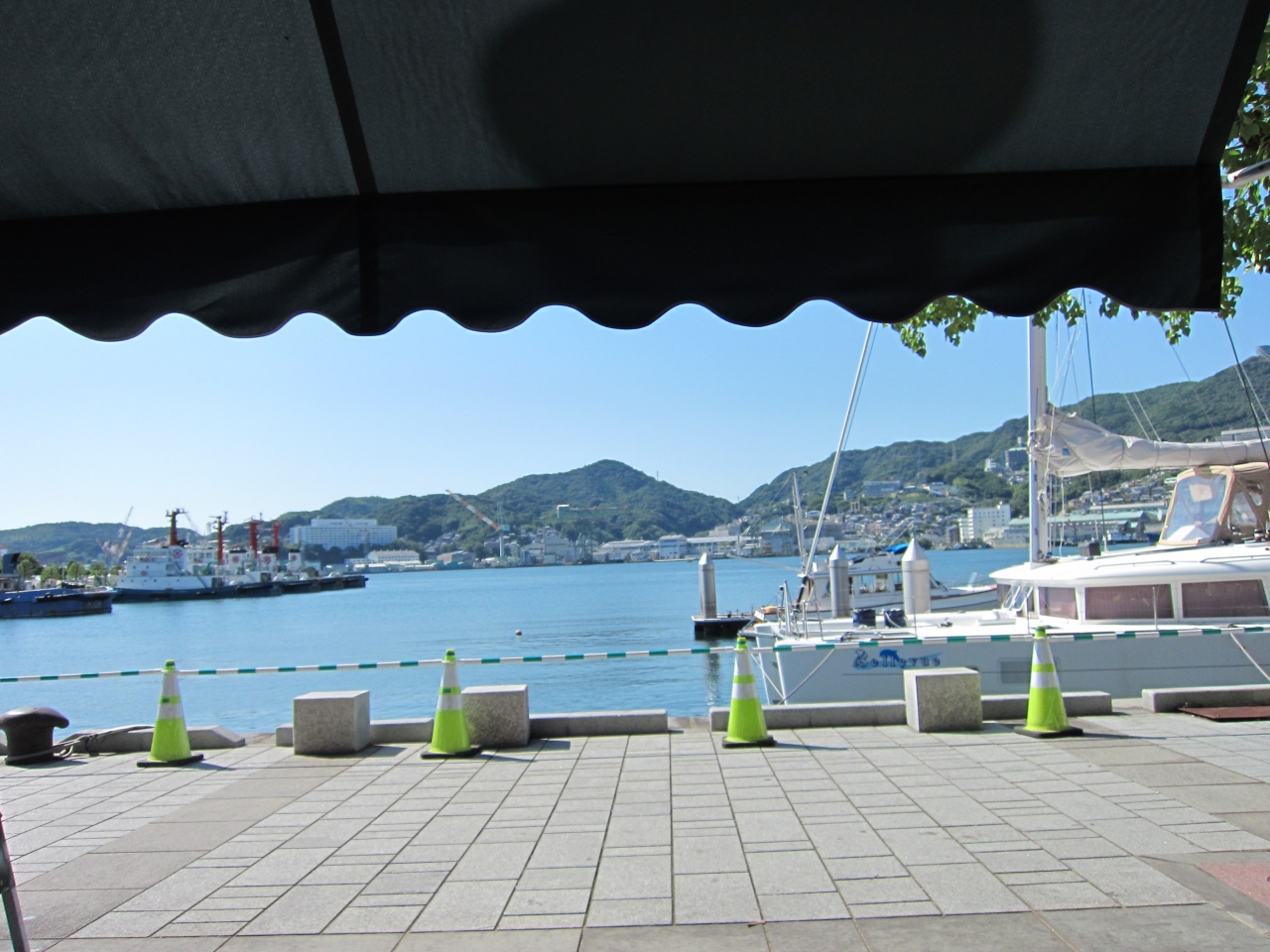 日曜の昼で出島ワーフはたくさんの人出でした。昼少し過ぎて、ランチ客が減り始めたので、こちらで珈琲時間にしました。キャラメルラテ、カフェラテで写真のようなカップが出てきました。目でも楽しめますが、味の方もおいしい珈琲でした。