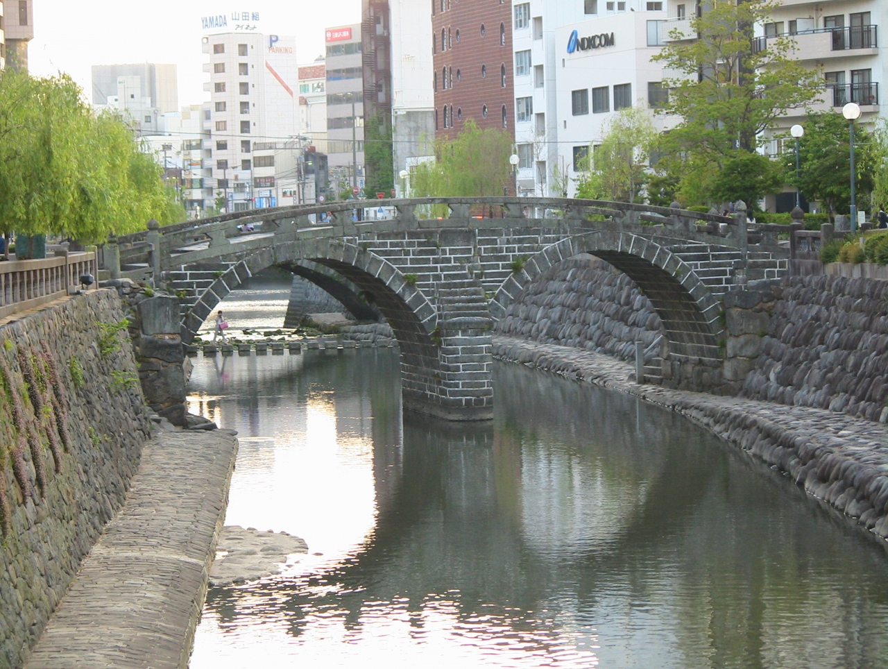長崎に行ったら、とにかく一目でもいいから見ましょう。中島川に架かる石造二連アーチ橋は、国の重要文化財になっており、沖縄の首里公園にある天女橋に次いで古い石のアーチ橋です。なお、橋の付近の堤防にハートの形をした石が20個くらいあるので探してみてください。