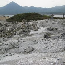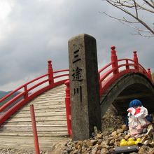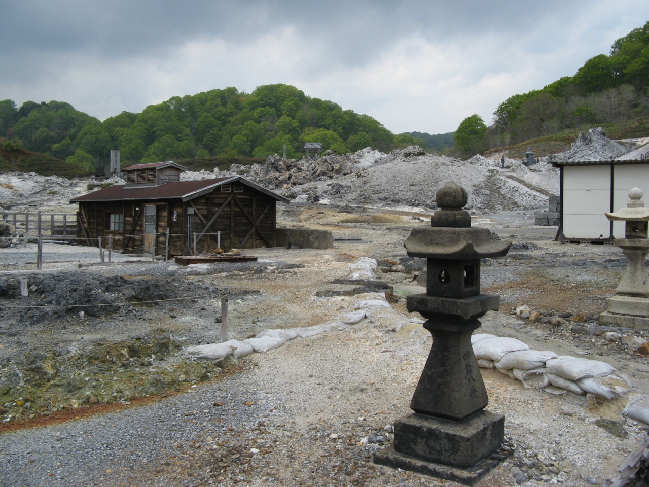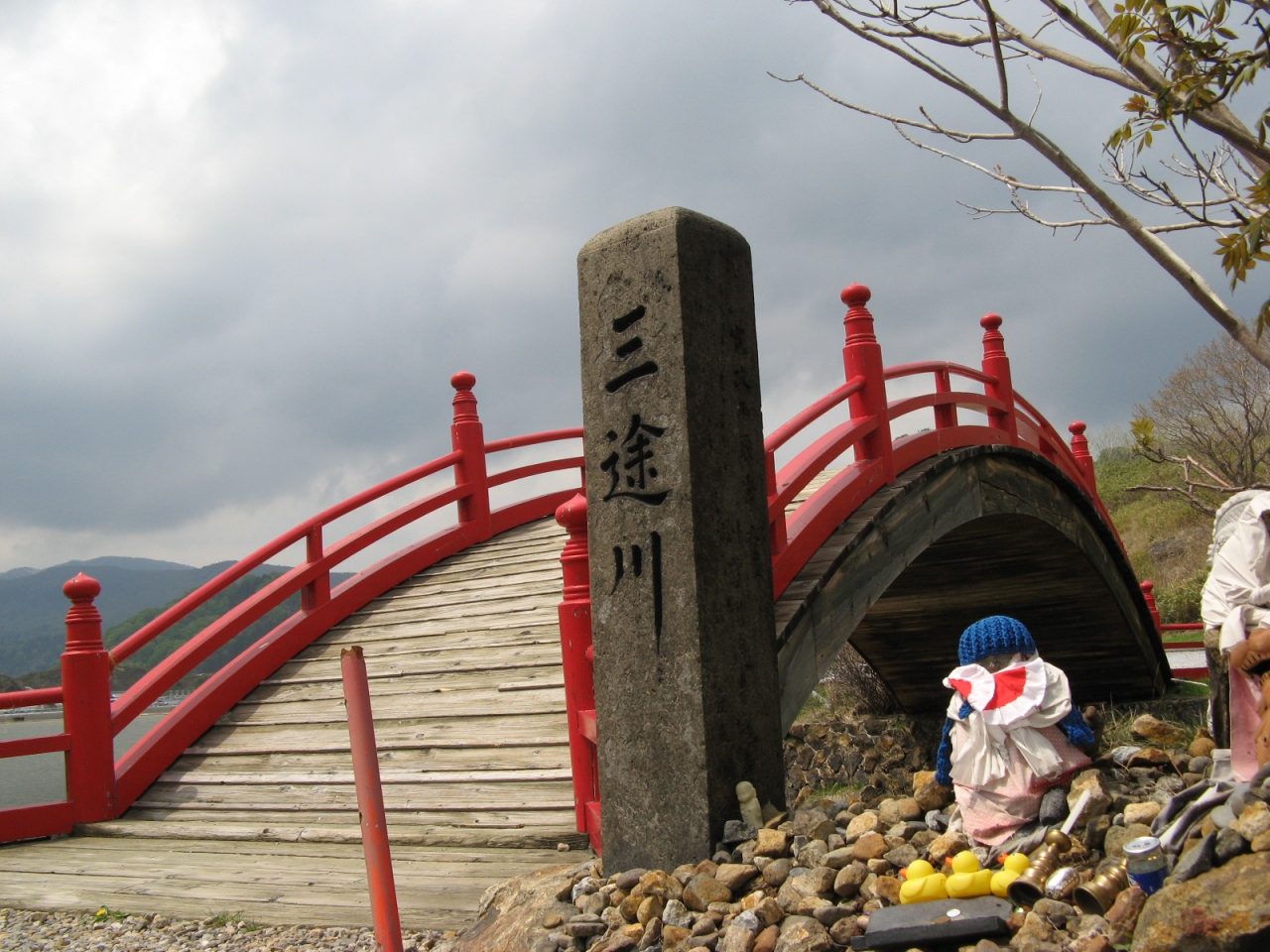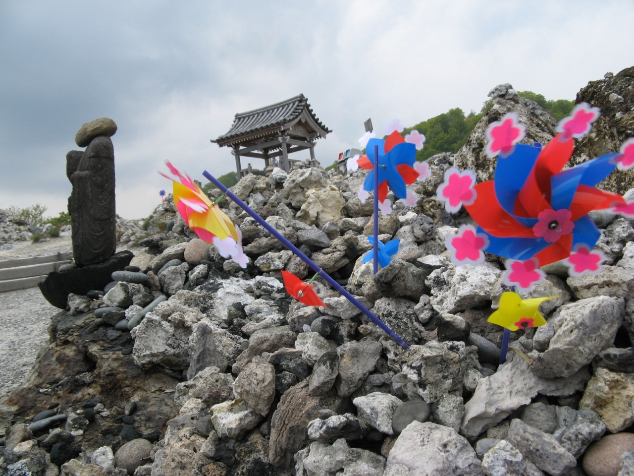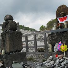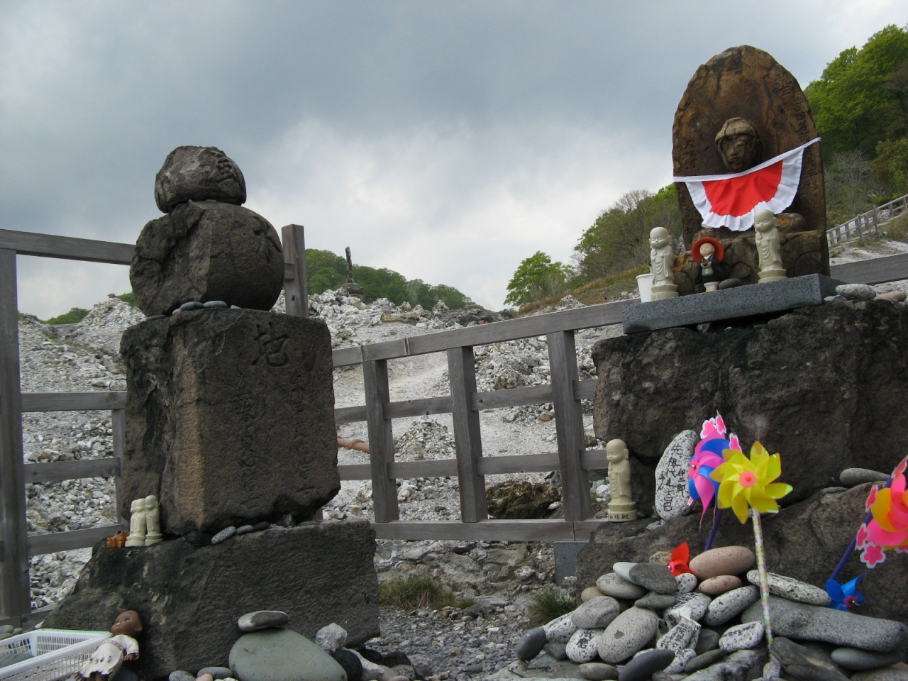 三途の川のところには真っ赤な太鼓橋がかかっていて、あの世とこの世の雰囲気を醸し出していました。硫黄のにおいが立ち込める中、あちこちに積み上げた石やその周りで回る色とりどりの風車、ボロボロに風化した小銭、数多くのお地蔵様、これまで見たことのない異様な風景でした。