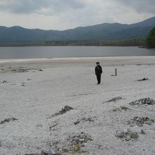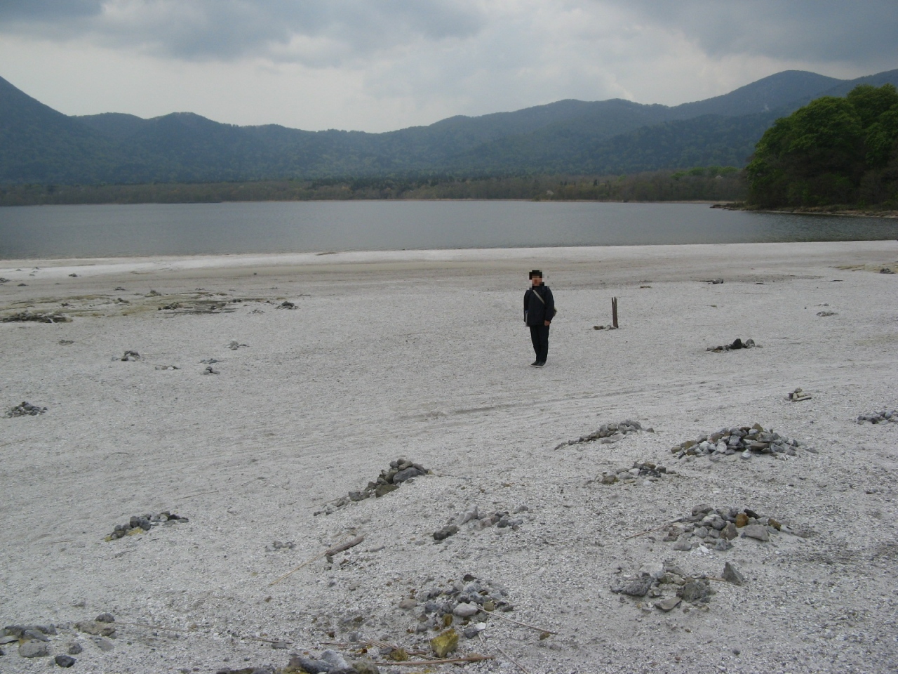 恐山菩提寺の境内の奥の方にあります。訪れたときは天気が悪かったので、それがかえって恐山の持つ雰囲気とあって不気味な感じがしました。賽の河原を歩いて湖の傍に行くと青っぽい湖の中に温泉らしいものが湧き、火山ガスや水蒸気が噴出しているのが見えました。酸性の湖なので、魚が住めない湖だと思っていましたが、世界でも珍しい天然ウグイの棲息地となっているそうです。