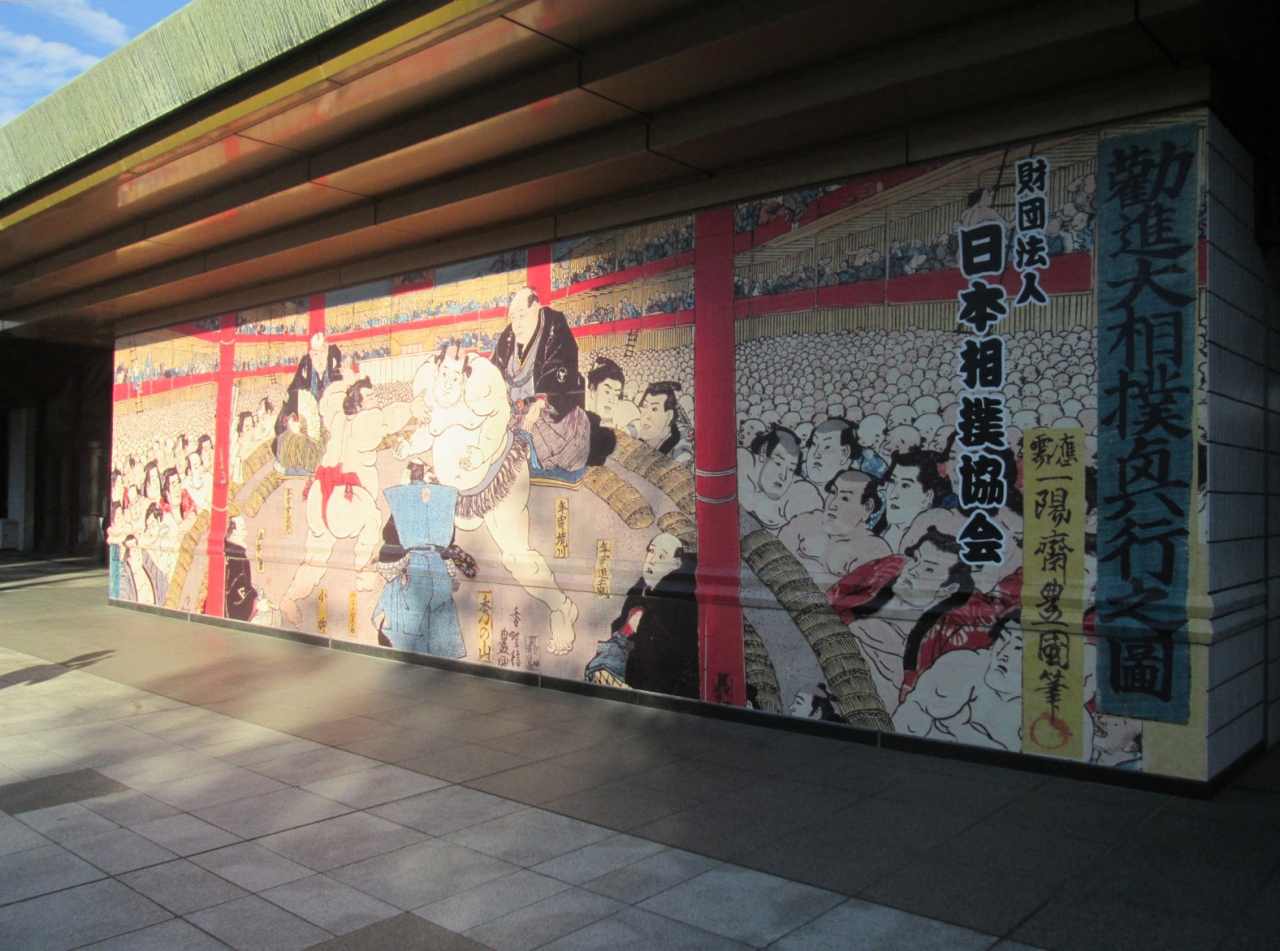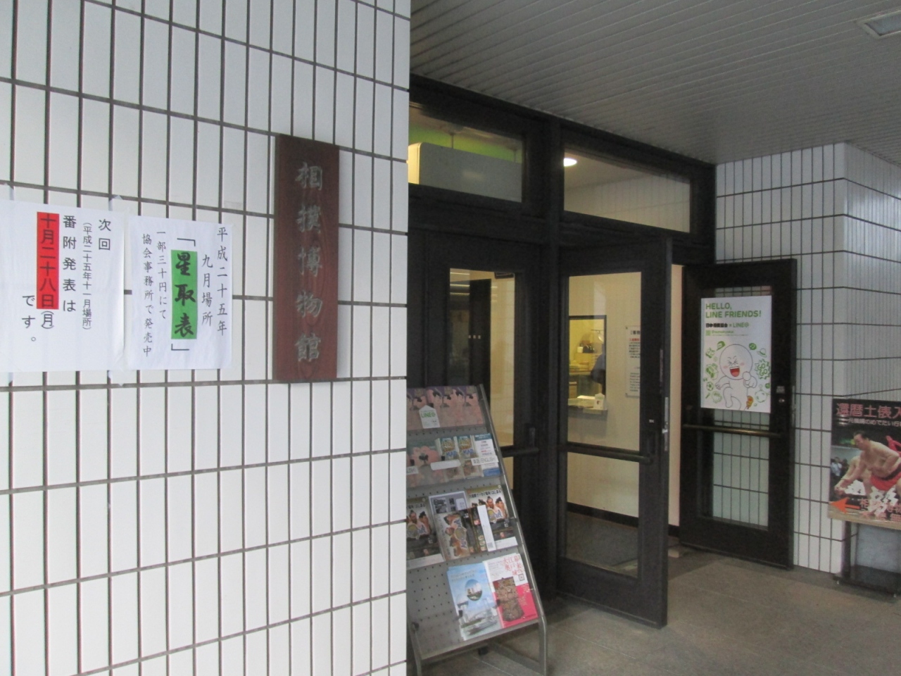 天下の日本相撲協会、やはり相撲に関する博物館を持っていました。場所はもちろん大相撲の殿堂「両国国技館」内ですから、やはり大きな期待を持って訪れました。JR「両国」駅に隣接する「両国国技館」の敷地に入ると、正面玄関の右手の一角に目指す「相撲博物館」がありました。入口はこじんまり、博物館を表わす表札とパンフレットのラックがなければ、通り過ぎてしまいそうな佇まいです。さて館内に入ると、思わず「えっ?これだけ?」って呟いてしまいそうな位の規模で、想像は見事に裏切られました。展示テーマはしばしば変わるようですが、今回は今まで”還暦土俵入り”を披露した9人の名横綱にスポットライトを宛て、その”還暦土俵入り”に用いた赤い綱、化粧廻しなどが、戦績などと共に展示されていました。博物館の規模は小さいですし、展示品の数も多くはありませんが、”相撲好き”の目を輝かさせる、そんな場所であると思います。