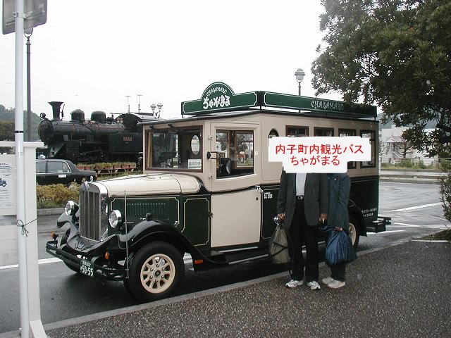 JR内子駅と内子の町並駐車場を結ぶ粋で便利なレトロバス「ちゃがまる」。ちゃがまるはこの地方の方言で壊れるとかダメになるとかうまくいかないこと。