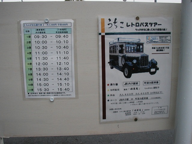 現在は週4日、定期便は金土日月でJR内子駅と町並みとからりとを、ぐるぐる回ってます。定期バス以外にも貸しきりバスやお好きなプランでも対応します。けどちゃがまり(壊れ)ますよ。(大西啓介氏談)