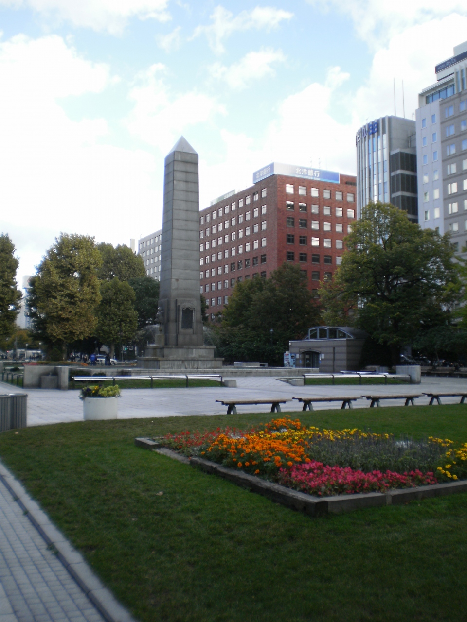 札幌の大通公園にたつオベリスク風の石塔が、聖恩碑です。 天皇行幸と札幌の水道の通水を記念した塔なのだそうで、下の方に水が吹き出る噴水になっています。 大通り公園にはいろんな噴水があって、子供が遊べるものや芸術的なものもあります。