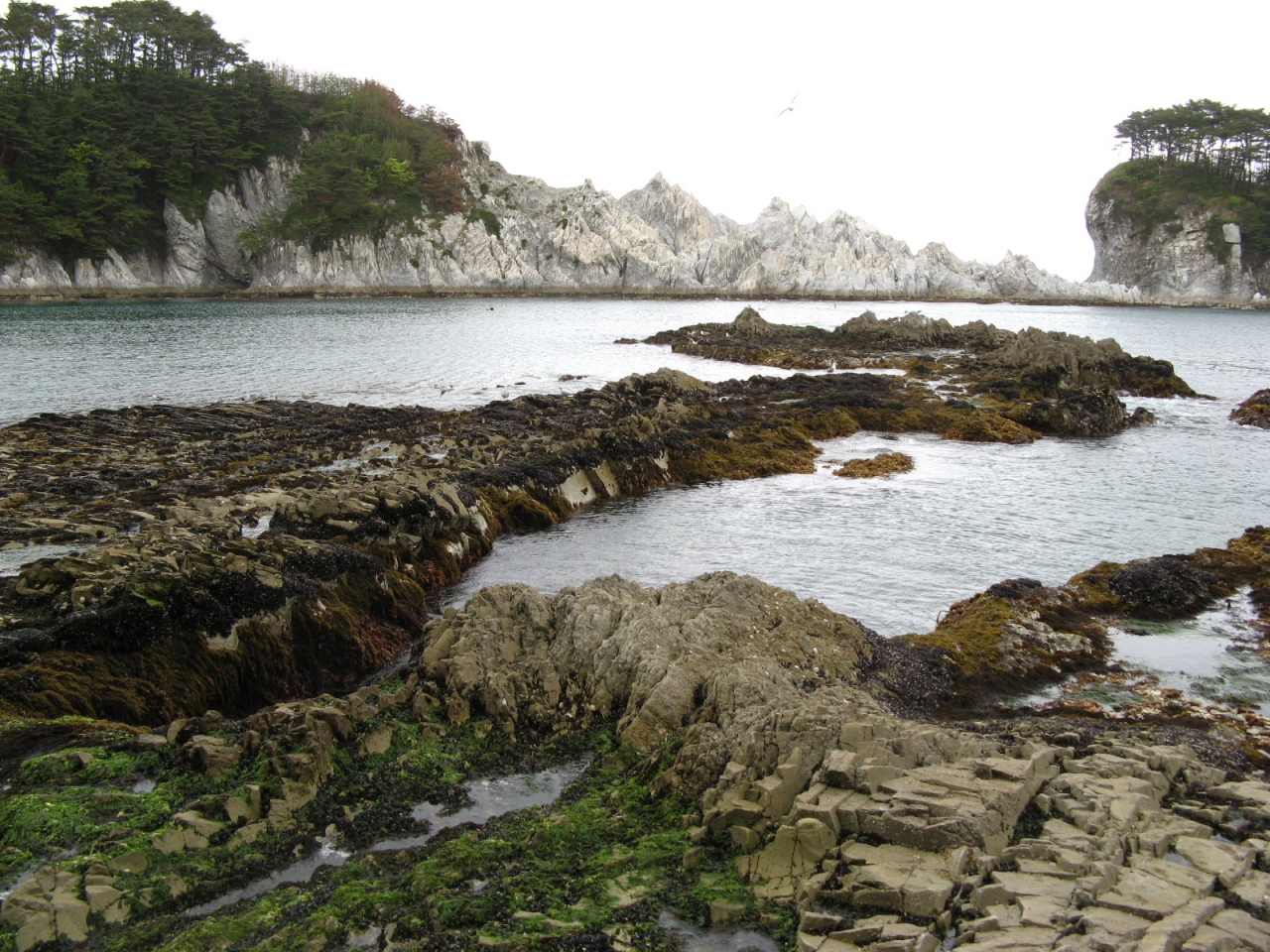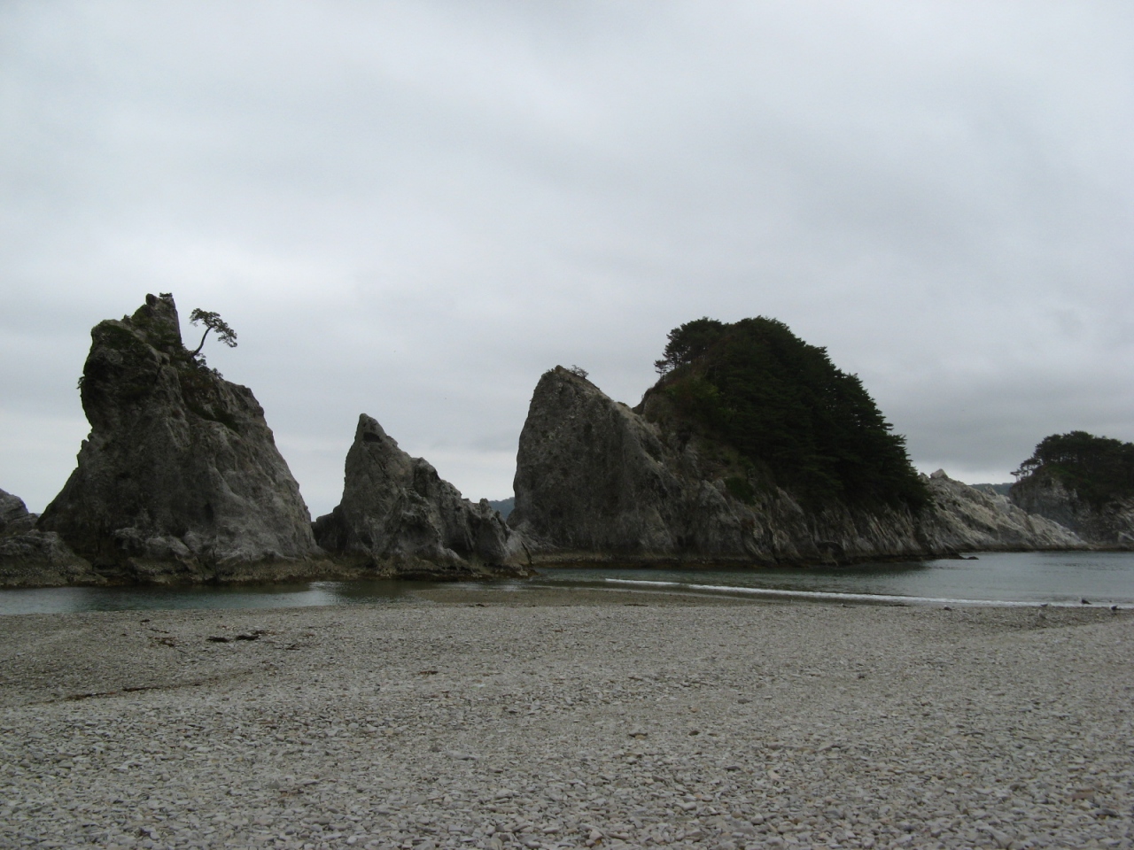 三陸海岸きっての名勝、極楽浄土のように美しいことから名付けられたと言われています。駐車場から10分ほど遊歩道を歩くと、白い砂浜とそれを取り囲むように奇妙な形の白い岩が連なって立っています。極楽浄土かどうかは別にして、不思議な光景の海岸でした。海から眺めたい人は、近くに観光船の乗り場があります。