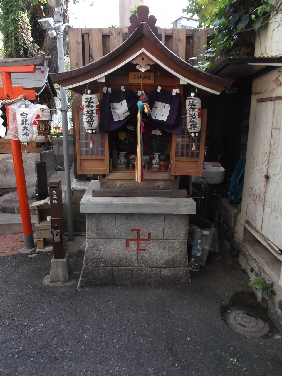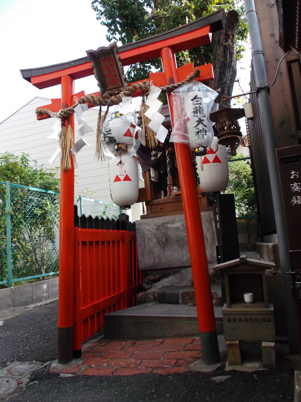 なんや、細い路地の突き当たり付近にお堂が・・白龍大明神の白いノボリがたなびいてる。興味引きます・・そこには小さなお堂と鳥居と祠がありました。後ろには御神木?老樹の楠。白龍・・白蛇・・財宝にご利益・・勝手に解釈してお参りさせていただきました。
