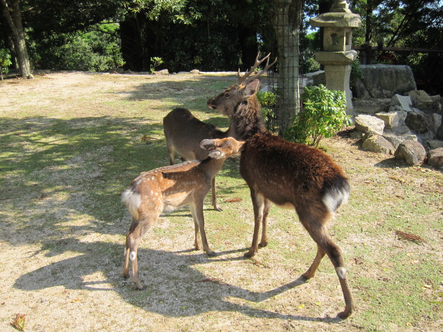 尚、お堂の後ろには瀬戸内の海景や半野生の鹿がいる。
