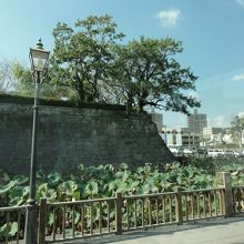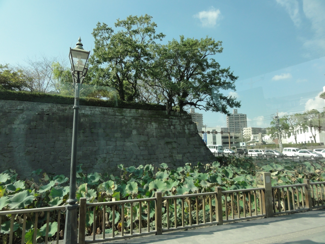 市の定期観光バスで車窓、停車案内されました。お城と言うと山の上にあるイメージですが城山の付け根みたいな平地にありました。いざという時は裏の城山にある城を利用したそうです。石垣とお堀、大手門の石橋が残るのみで、敷地内には県立の資料センターや図書館があるそうです。