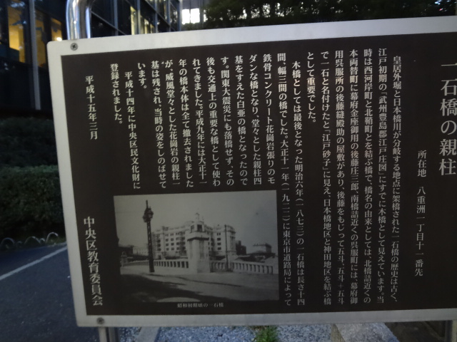 東京駅八重洲口のすぐ近く、首都高速道路「呉服橋ランプ」の近くにある一石橋の親柱が「中央区民文化財」の指定を受けているそうです。