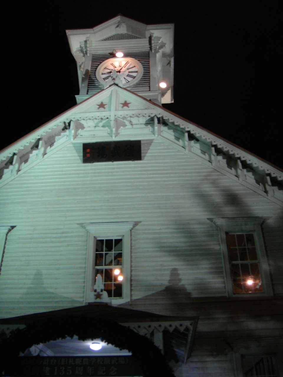 札幌の観光名所時計台は、夜でも観光客が大勢訪れていました。みなさんライトアップされた時計台を、交差点横にある記念撮影用の台から順番にあがって、撮影しております。