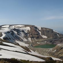 5月の中旬に行ったのですが、御釜の周囲は残雪があり、雪の白色と御釜のグリーン色と青空とのコントラストが大変綺麗でした。