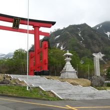 湯殿山道路の終点に広い駐車場がありま、大きな赤い鳥居が立っています。駐車場から本宮までは徒歩かバスで行きます。徒歩約20分、バス5分で片道200円、往復300円です。往復バスで登りました。