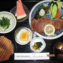 “牛ステーキ定食”を頂きました。150グラム足らずのステーキに菜物の御浸しと豆腐の小鉢に味噌汁、デザートの西瓜がついて3500円でした。お肉は柔らかくてジューシーで普通に美味しかった。