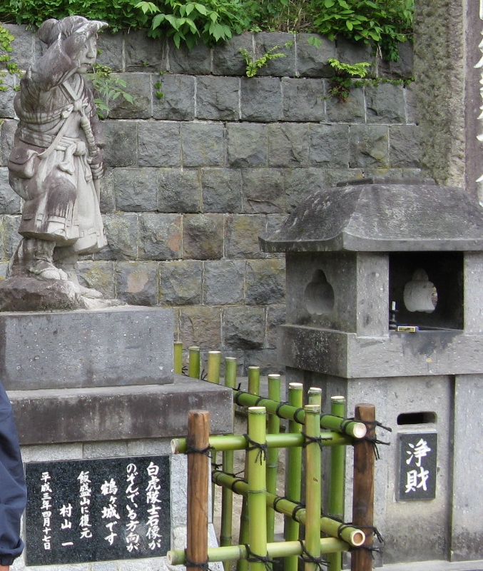 飯盛山の中腹、見晴の良い場所に石碑が立っています。会津戦争で白虎隊が戸ノ口原の戦いにおいて敗走した際に飯盛山に逃れ、鶴ヶ城周辺の武家屋敷等が燃えているのを落城と錯覚し、自刃したところです。若松城(鶴ヶ城)を見つめる小さな白虎隊の少年像が痛ましい。