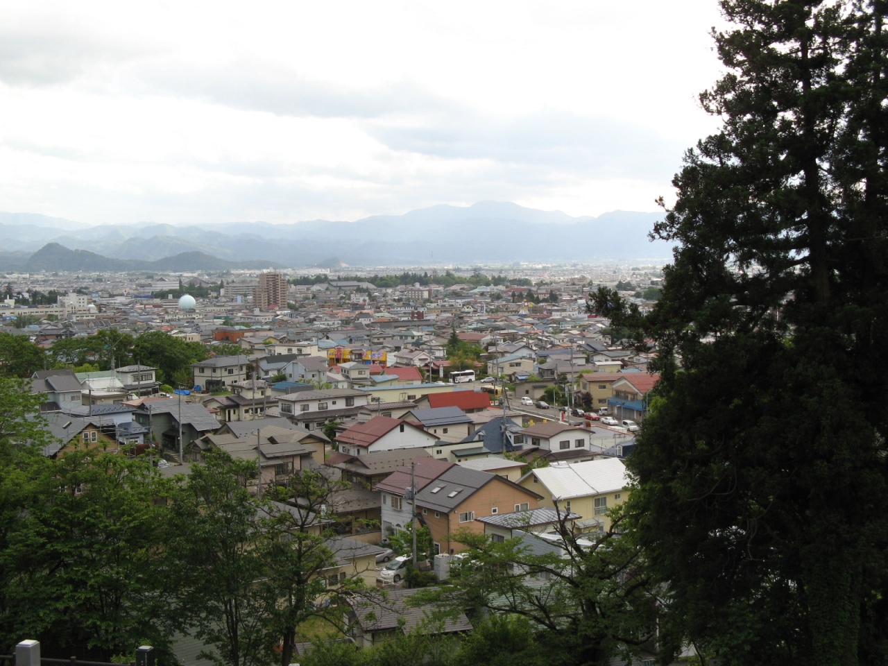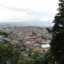 山の上まで有料のエスカレーター(動く歩道)に乗っていくことができますが、歩いて登りました。長い階段を登って頂上に達すると、広場からは会津若松市内を一望でき、鶴ヶ丘上城も小さく見えました。