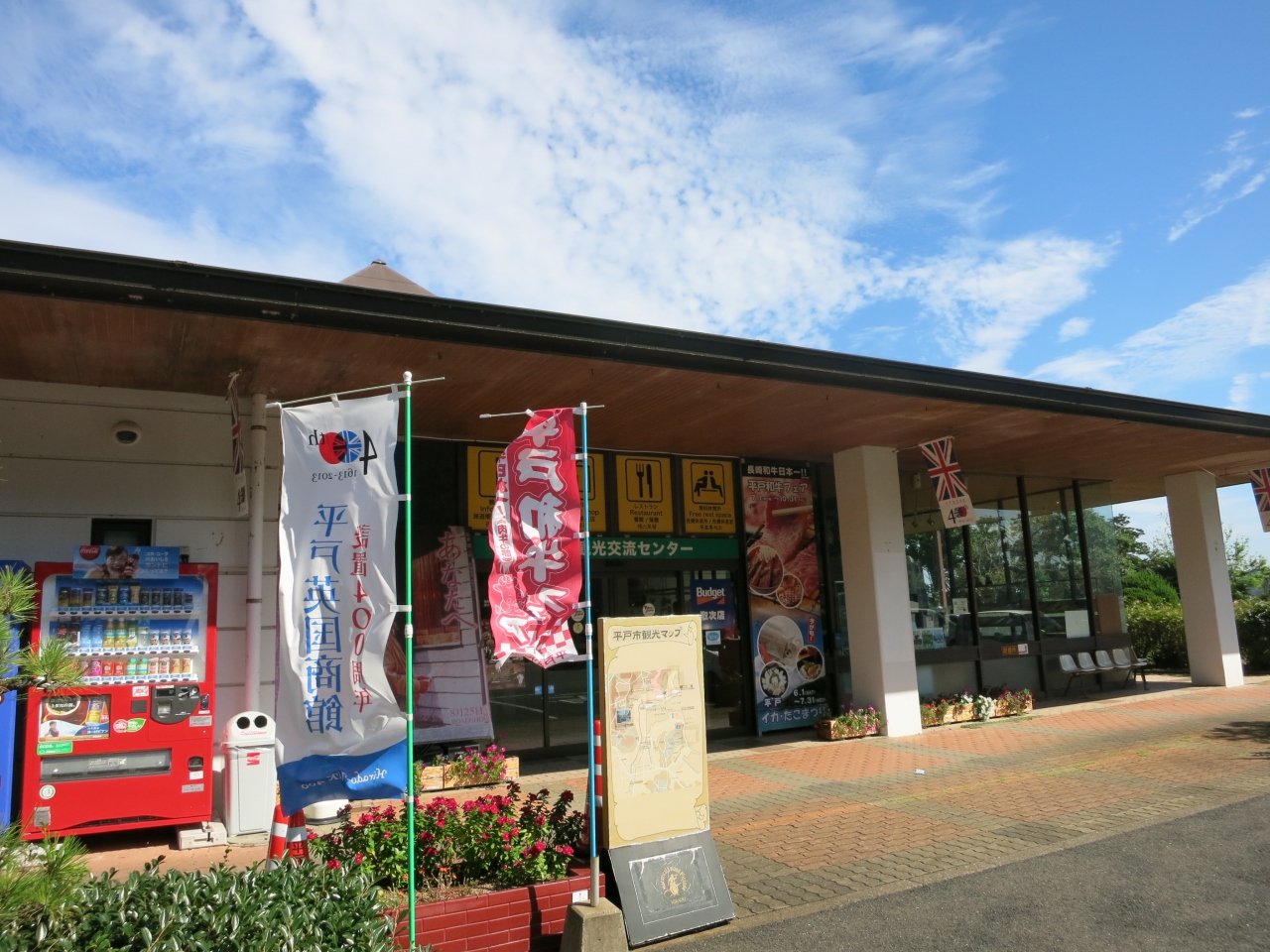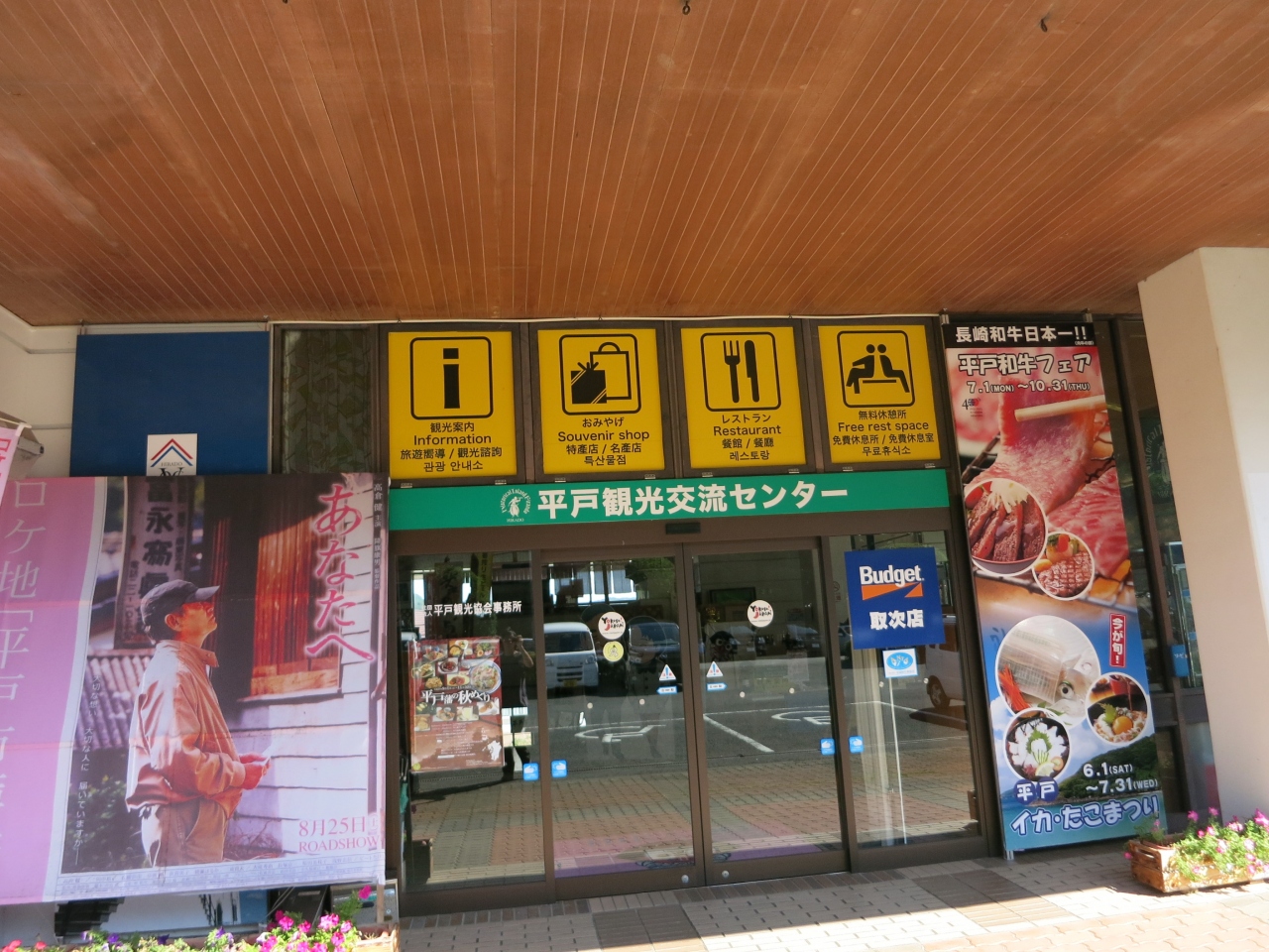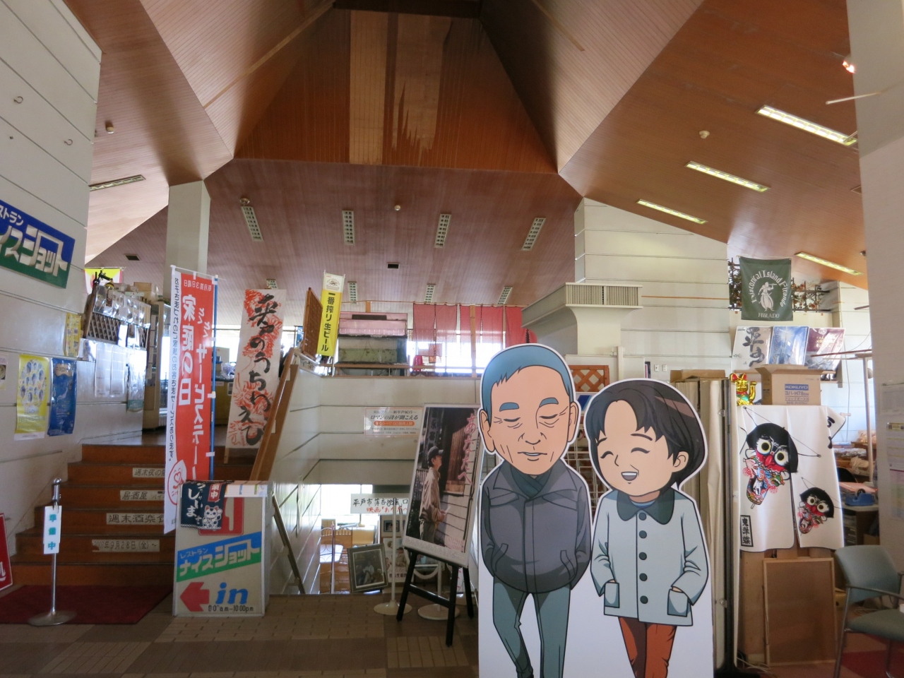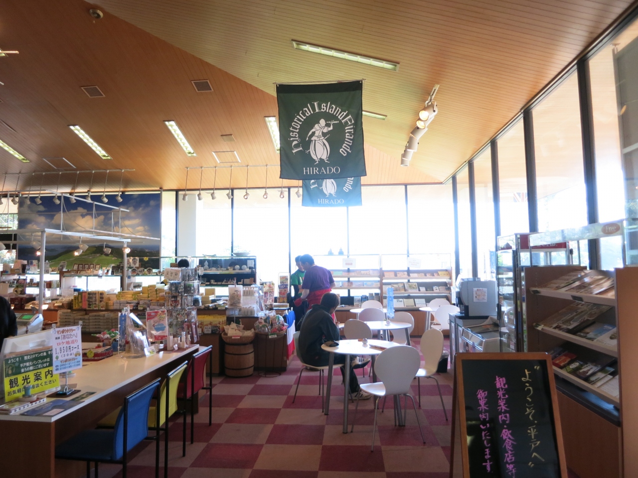 平戸観光交流センターとして平戸城の北側のふもとにあります。駐車場もあり、城観光の際に車を停めておくこともできます。建物内にはおみやげ売り場やレストラン、ミニギャラリーなどがあり、協会として観光案内もしています。椅子や各種観光パンフレットが置かれていました。
