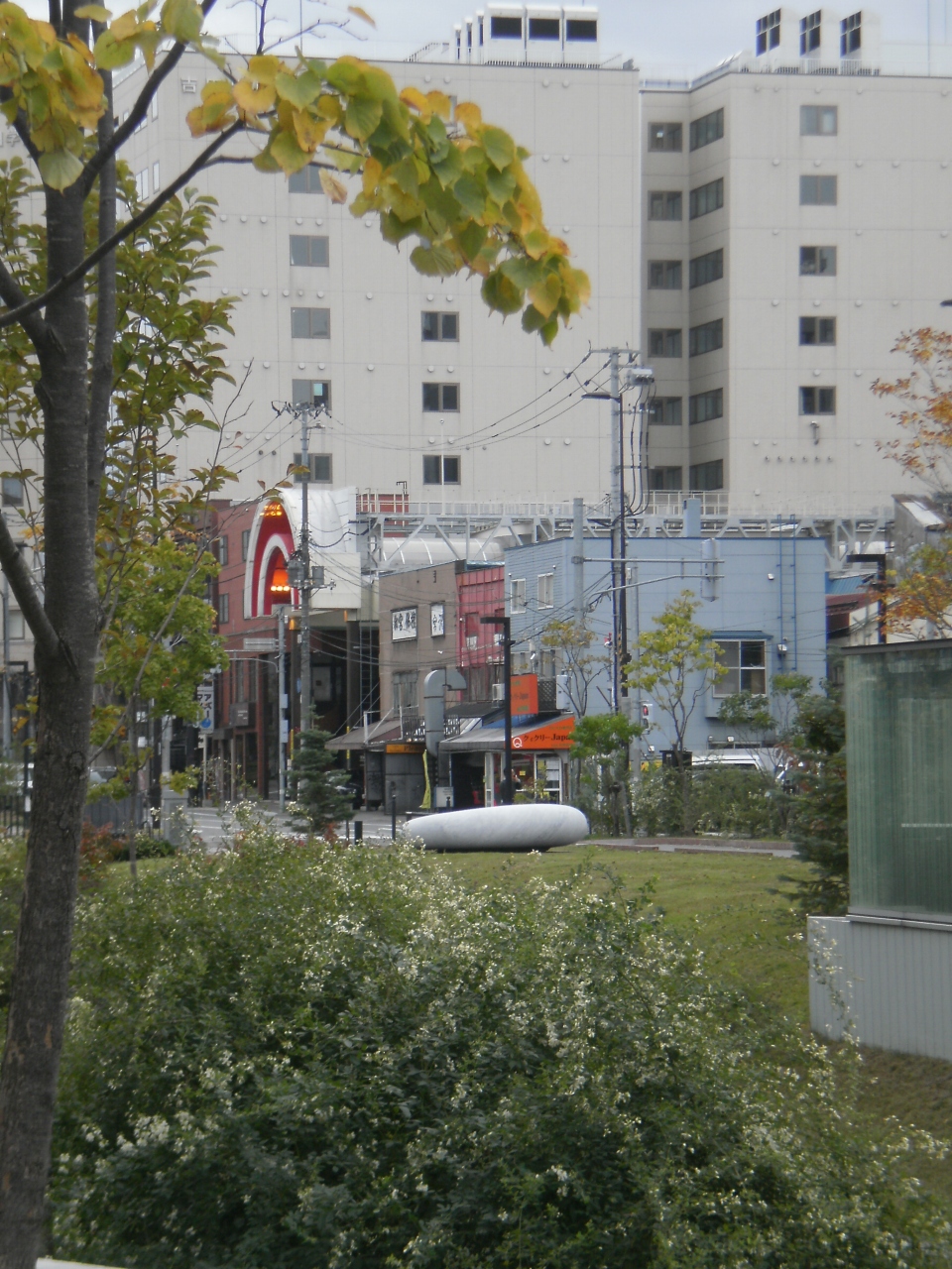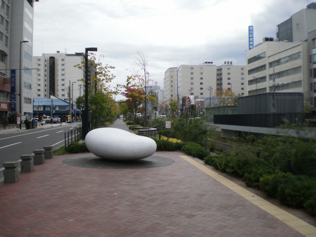 札幌の創成川公園は、創成川の両岸を利用した細長い公園です。 そこに、白い2つの大きな石が離れておかれているのが、野外芸術の天秘です。 もう札幌はだいぶ寒くなってきたので、木々が紅葉していて、白い石が浮き出してみえました。 天秘は新しい生命を宿すゆりかごみたいな感じだと思います。