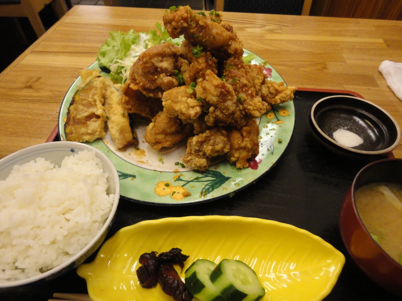 デカ盛りの「唐揚げマウンテン定食」で有名なお店。大ぶりの鶏唐揚げが山のように積み重ねられており初めて見る客は必ずと言っていいほど「ギョッ!」とする。揚げたての衣はサックサクで中の鶏肉はジューシー♪まいうー!女性客は食べきれないので店員さんへ言えば貰えるサランラップに残りを包んで持ち帰りしている。ちなみに「鶏炭火焼き定食」も食べ応え充分である。