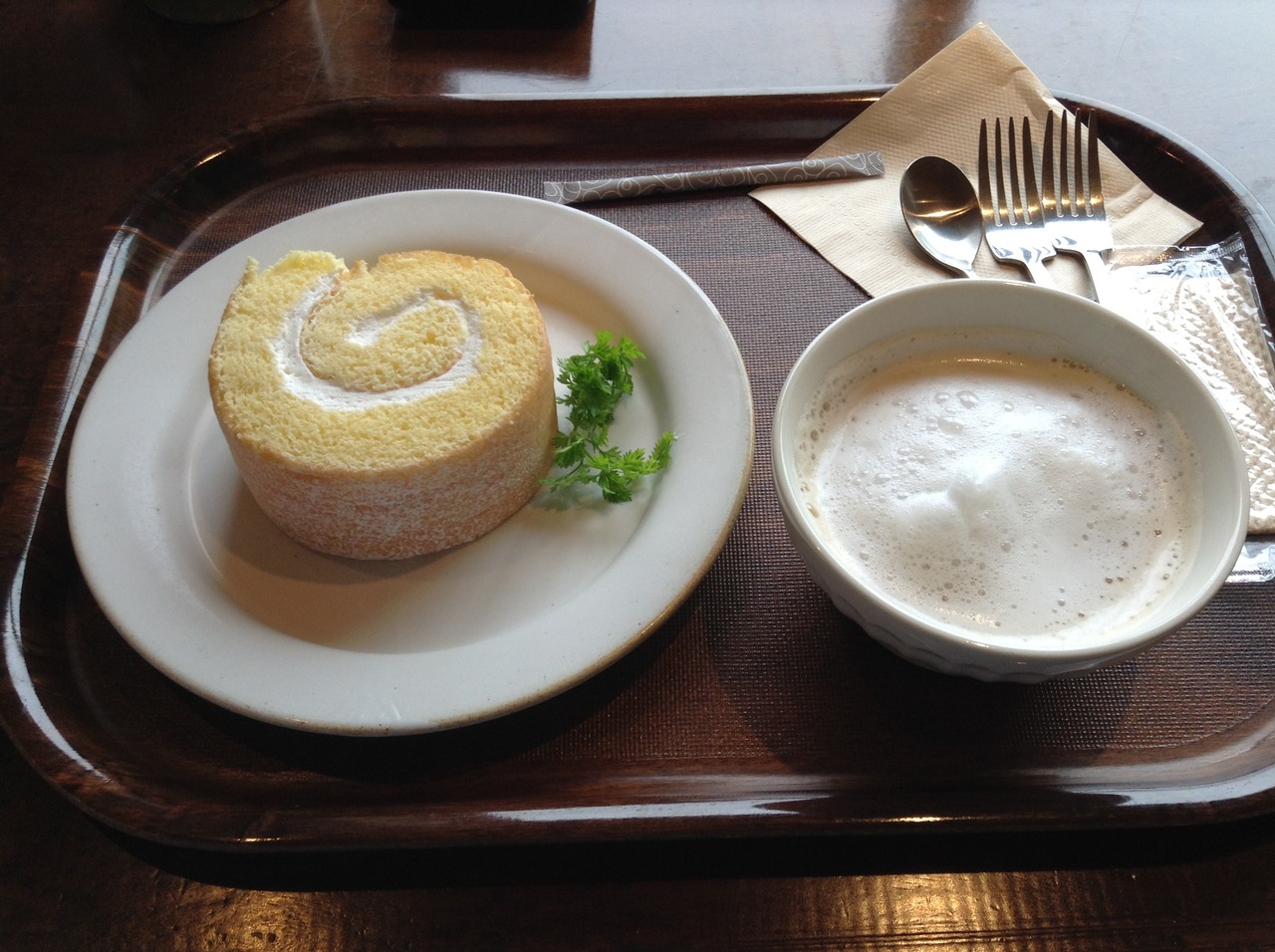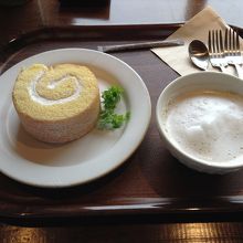 ロールケーキは、厚切りでサイズも大きく食べ応えがあります。カフェオレは、ボール型の器に、二杯分ぐらいの量がなみなみ入っています。