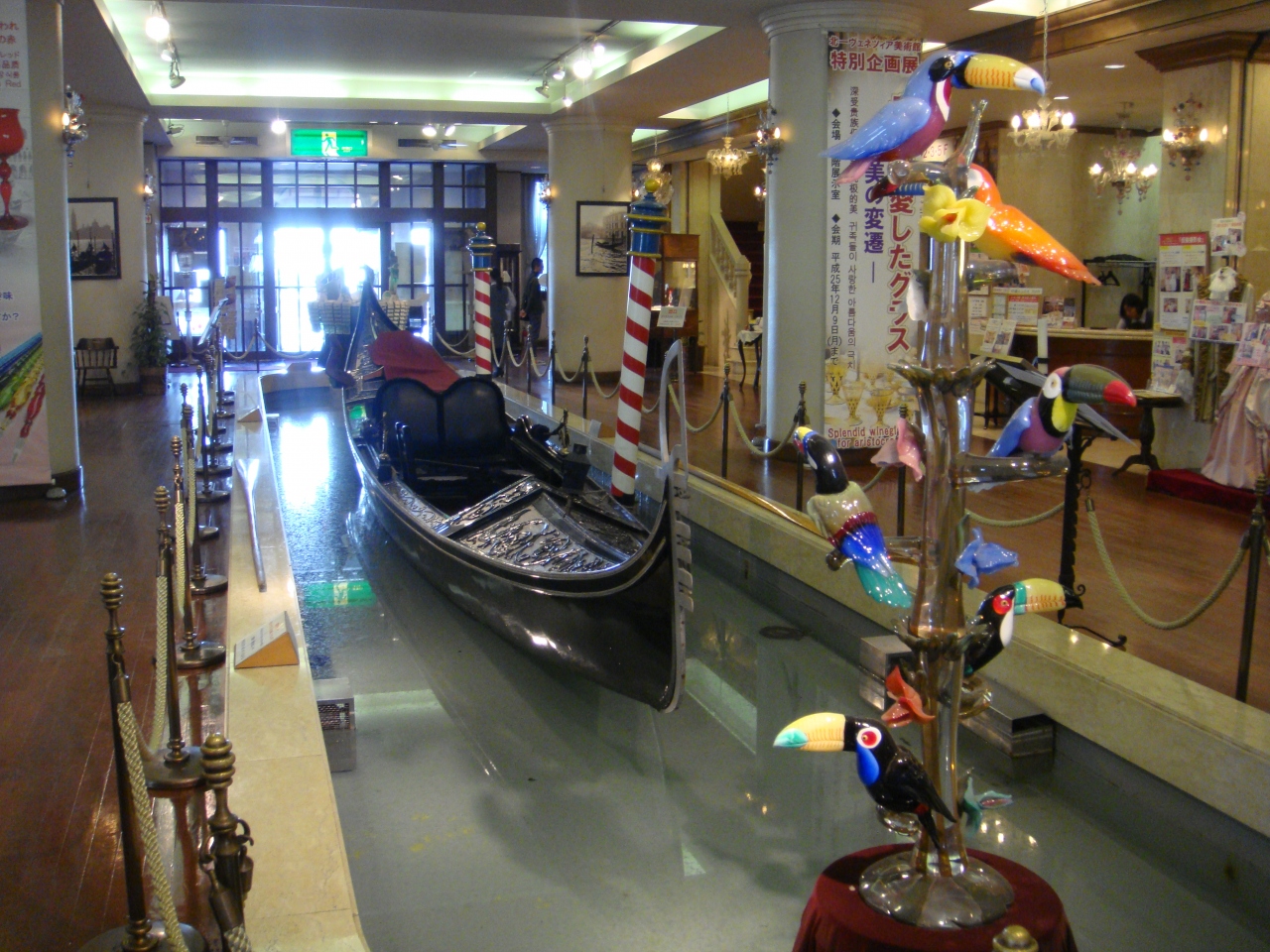 店内の1階の真ん中にプールが有り、本物のゴンドラが浮かんでいます。1階部分は無料で見学ができますが、ガラス製品の土産物店と変わりありません。2階部分以上は有料(700円)になっており、貴族の部屋や高級家具、ヴェネツィアガラスの博物館です。