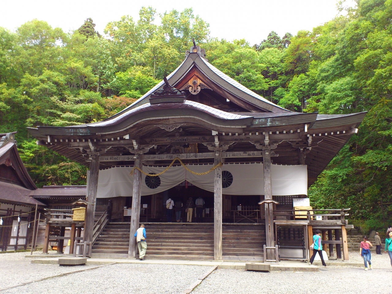 ですが駐車場から行くと、中社の裏から訪れる形になるので、脇道を下り正面の階段を上って参拝するのもオススメです。正面階段下には大きな三本杉もあります。
