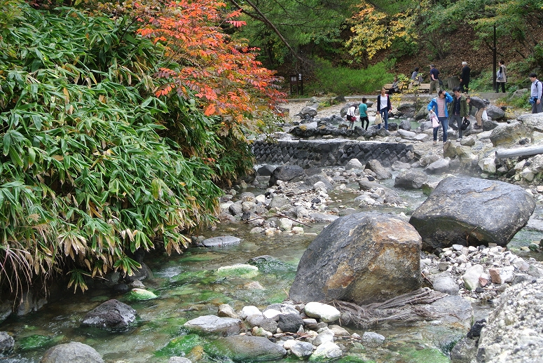 草津温泉街の中心地から徒歩で10分ほどの場所にあります。大きな大露天風呂が併設されていたり、なかなか見ごたえがある場所ですが、湯量が豊富なためか、温泉が川と一緒に流れているのがすごいです。紅葉の時期はさらに景色も綺麗です。