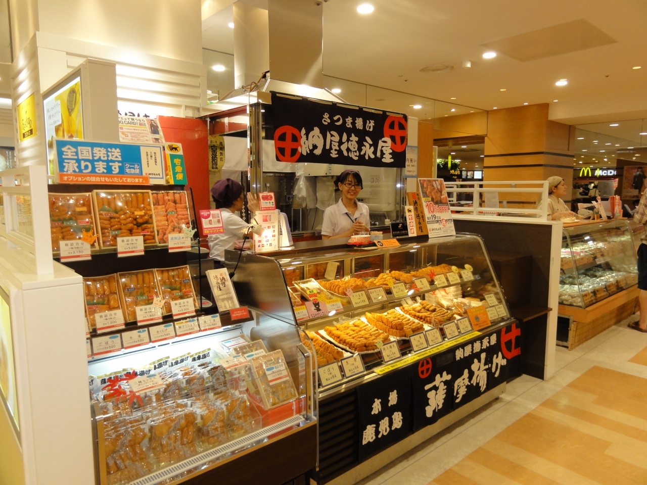 地階の食品売り場は、鹿児島ふるさと市場と名が付いていました。観光客用か、3軒のさつま揚げのお店があり、その中で種類が一杯ありそうなお店が納屋徳永屋でした。