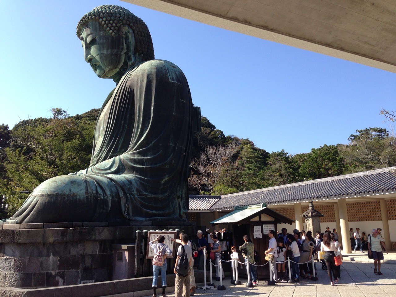 他の観光客の流れに沿ってしばらくすると大仏さんが居る高徳院に到着。拝観料200円を払い、入場すると青空の下、大仏さんがどっしりと座禅を組んでいる姿が見えて来ました。久し振りに見に来ましたが、迫力があります。海外からの観光客もたくさん来ていました。