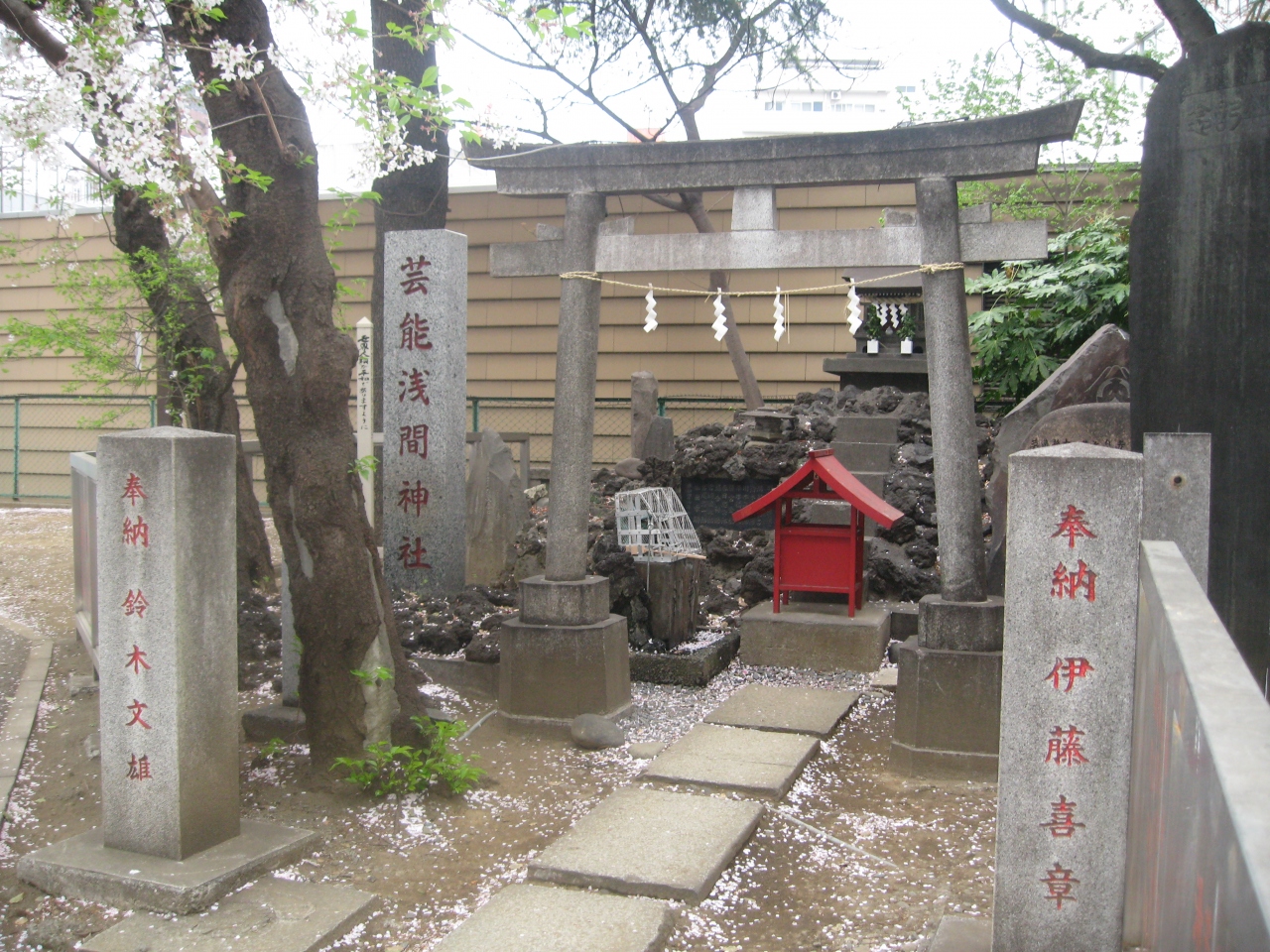 花園神社は昔から芸とは切っても切れない関係にありました。ここの浅間神社は全国1300ある浅間神社同様コノハナサクヤヒメを祀る富士山信仰と関わりのある神社です。富士塚も今でこそ高さ1.5mほどですがかつては新宿富士と呼ばれるほど大きな規模のものでした。現在では芸能人関係者が参拝することで有名な神社です。