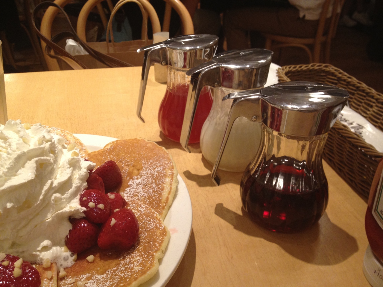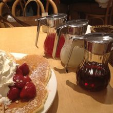 お店は混んでいましたが、オーダー後、10分程度で運ばれてきました。見た目はボリュームがあるのですが、パンケーキ上の生クリームは甘さ控えめでとても軽いです。
