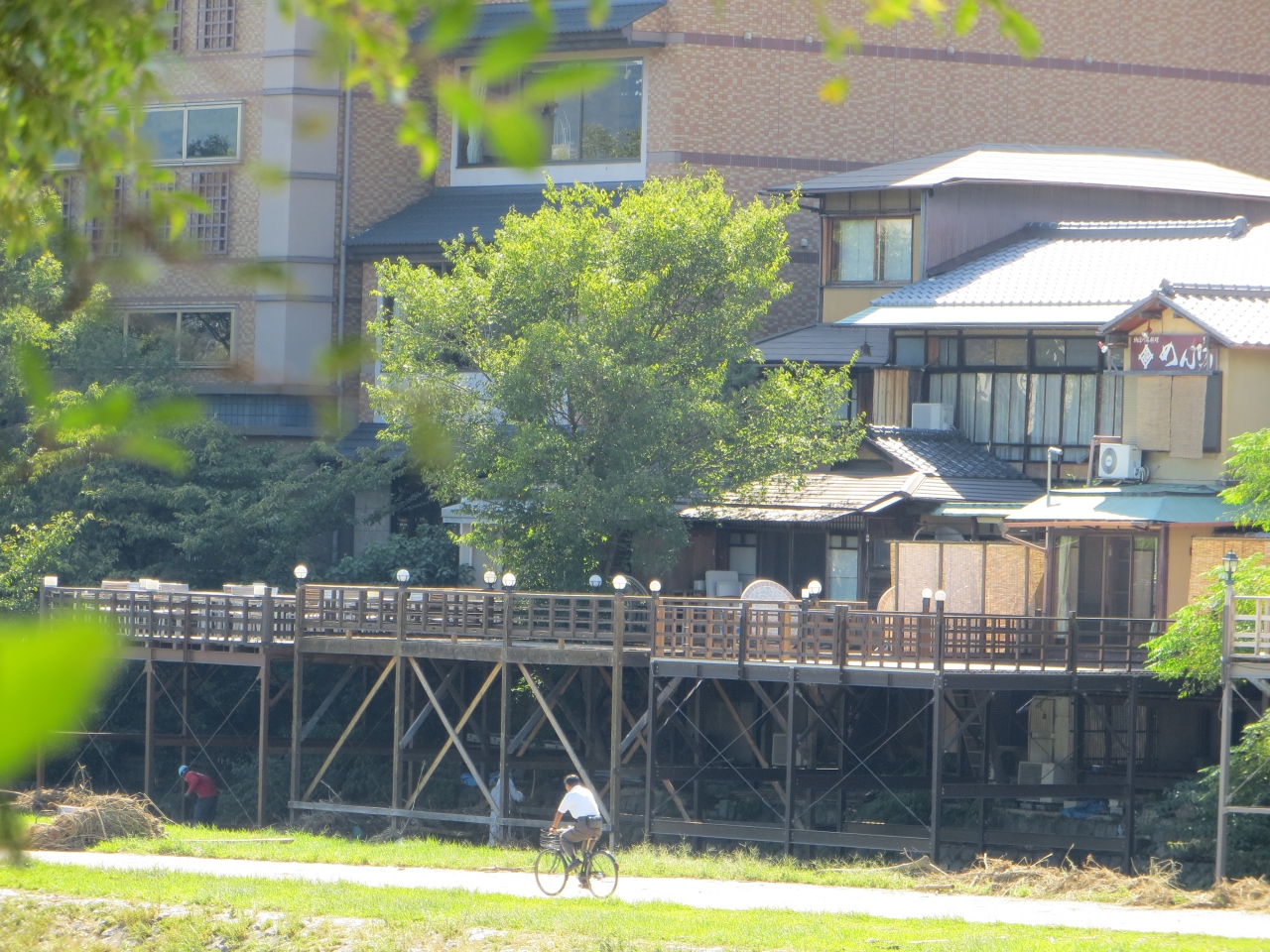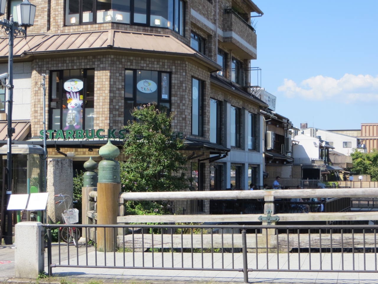 5月から9月まで京都では鴨川岸のレストランが川床になります。5月と9月はランチも川床になります(6月、7月、8月は夜だけ)。三条大橋のたもとにあるこのスタバはウッドデッキがあって、それがそのまま川床になります。鴨川に吹く心地よい風を感じてスタバのコーヒーも一層美味しくなりますよ。メニューも値段の他のスタバと変わりありません。
