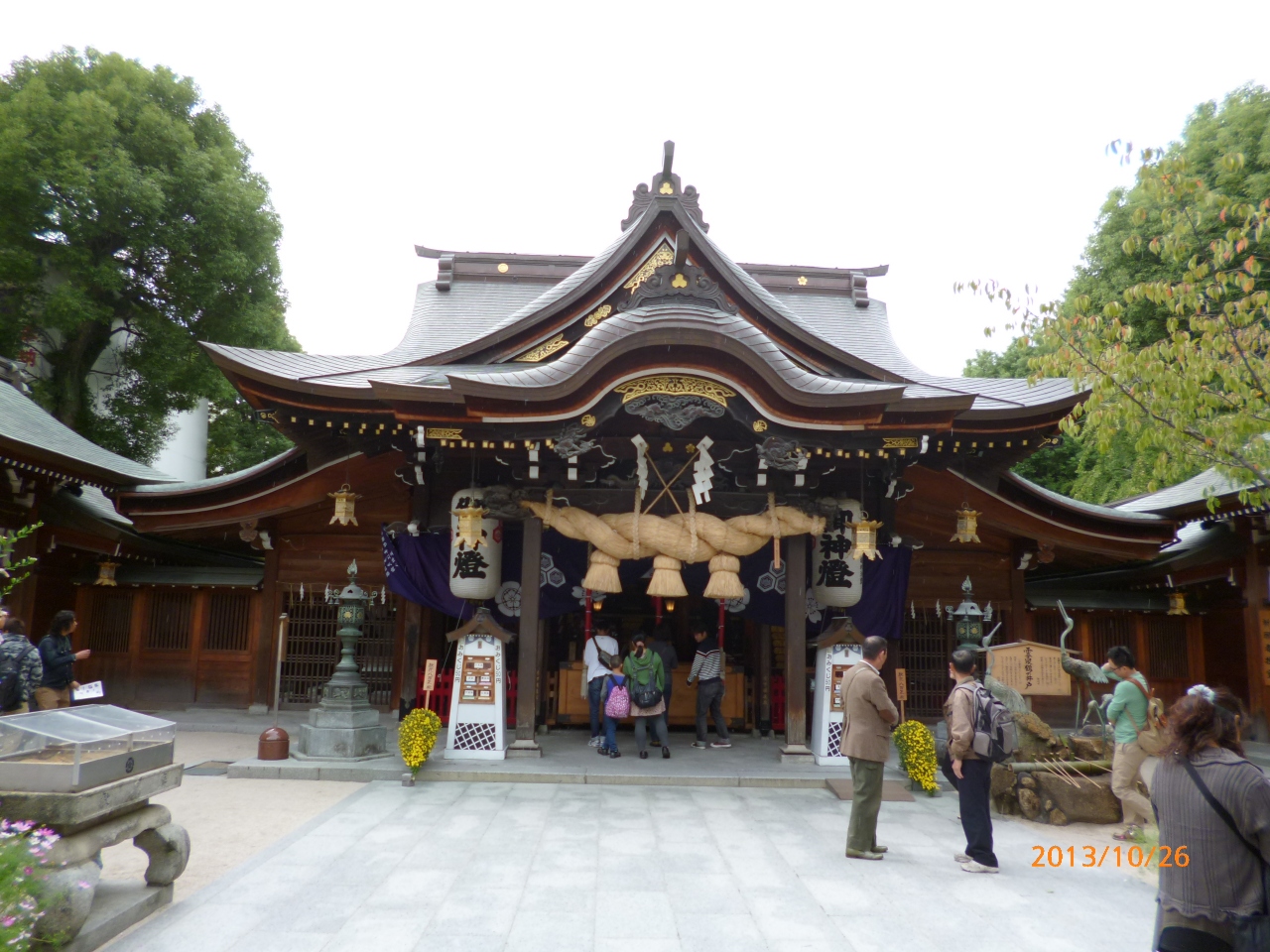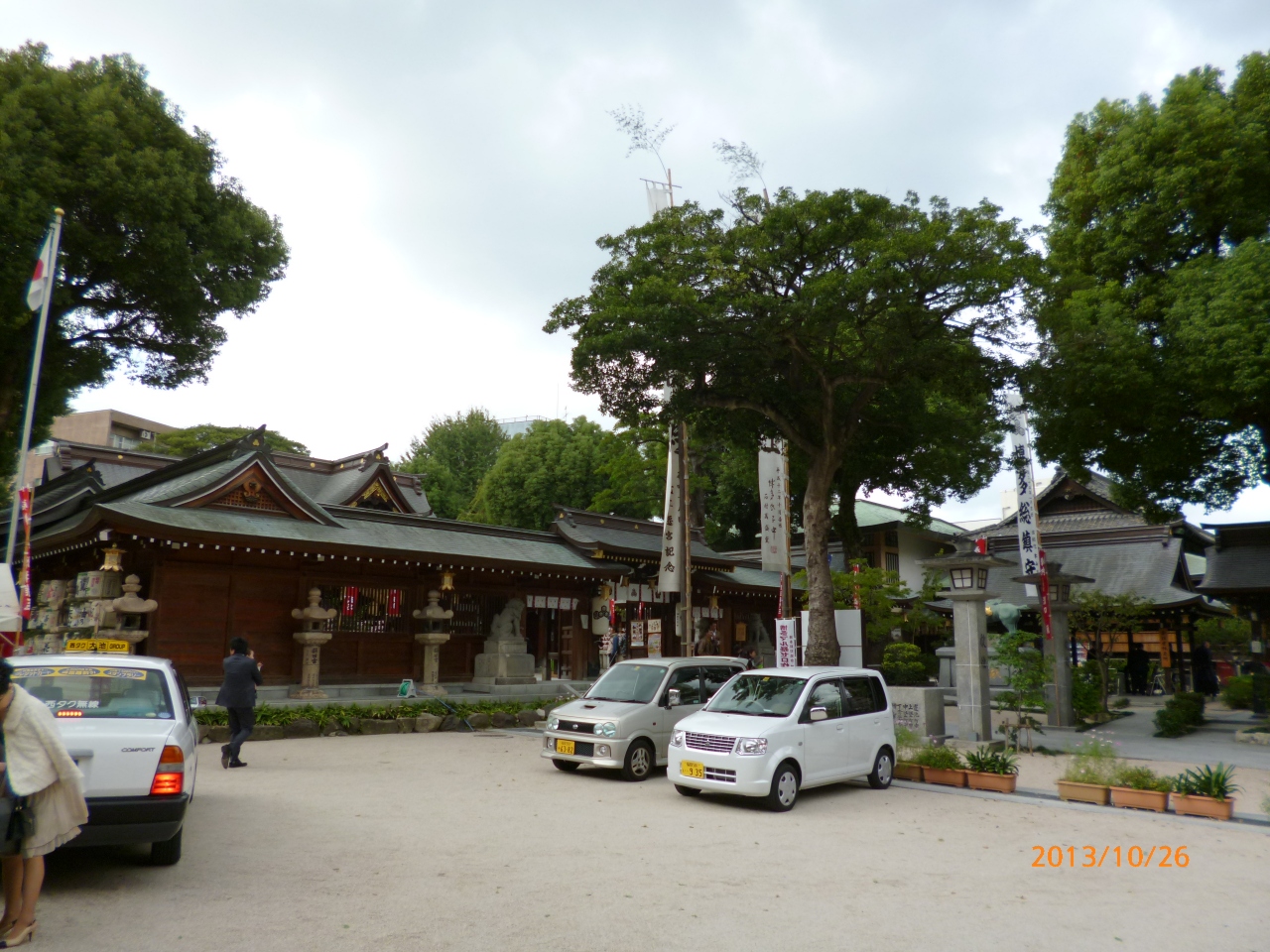 「お櫛田さん」で呼ばれる神社で博多山笠の追い山の出発地点です。毎年7月15日の午前4時59分太鼓の音でスタートします。夫婦大銀杏や常時設営されている飾り山笠(明治の初期は10m以上の飾り山笠が町を走り勇壮さがあったが現在は電線等により低くなった。本殿左手にある涌水は塩水であり是非、味わって欲しい。