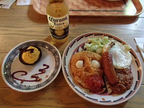 スケルトンをかたどったタコライスは目の部分にモッツァレラチーズが付いていて、シャキシャキのレタスとスパイシーなサルサソースとミートソース、半熟の目玉焼きが添えられていました。それらをミックスして食べるととても美味しかったです。骨付きのソーセージもジューシーでとっても美味しくコロナビールにピッタリでした!