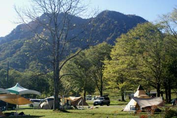 戸隠牧場からさらに進むと戸隠キャンプ場で、オートキャンプ場が整備されていて、戸隠山を望む広いキャンプ地ですがテント一張1,000円は山の上で考えられません。地図を見ると戸隠キャンプ場バス停はさらに先で、キャンプ場の入口の先の橋を渡った場所にあり、長野駅からのバスがちょうど到着したところでした。