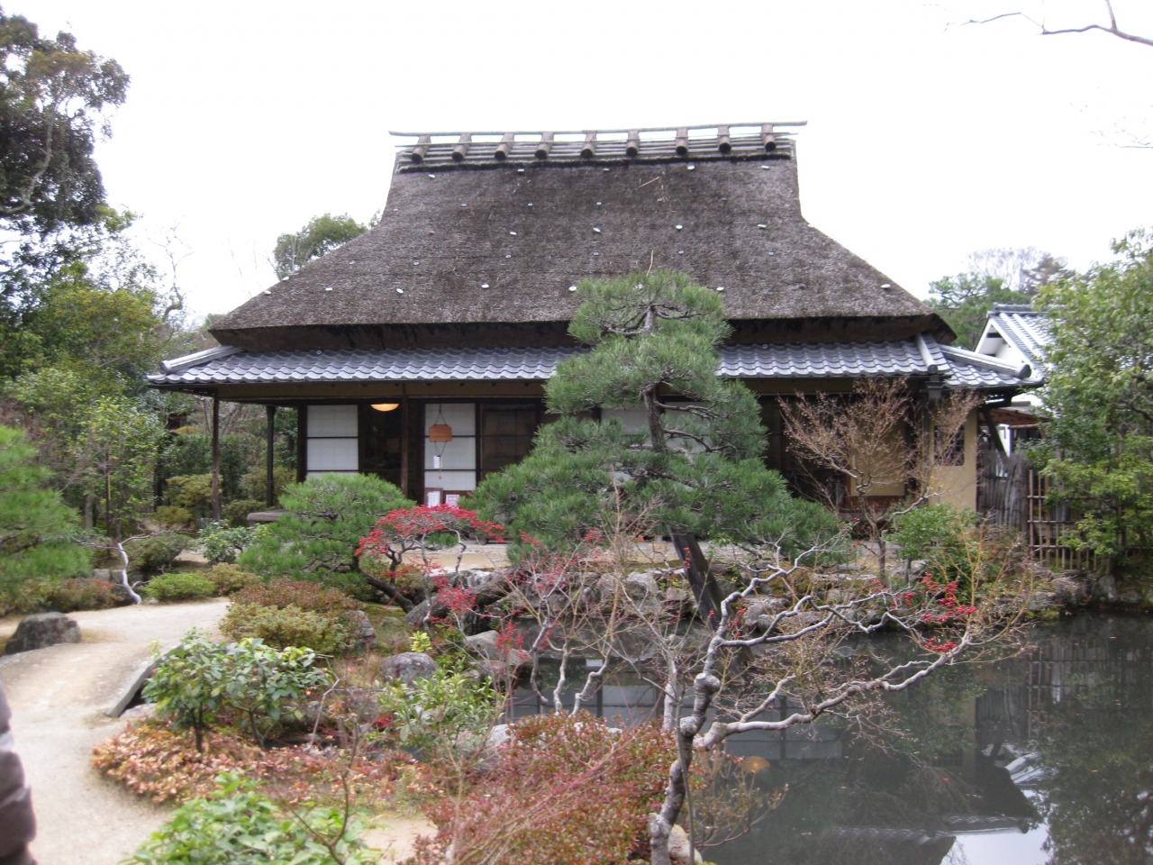 池の周囲に作られた庭園や、かやぶきの茶室「三秀亭」があります。