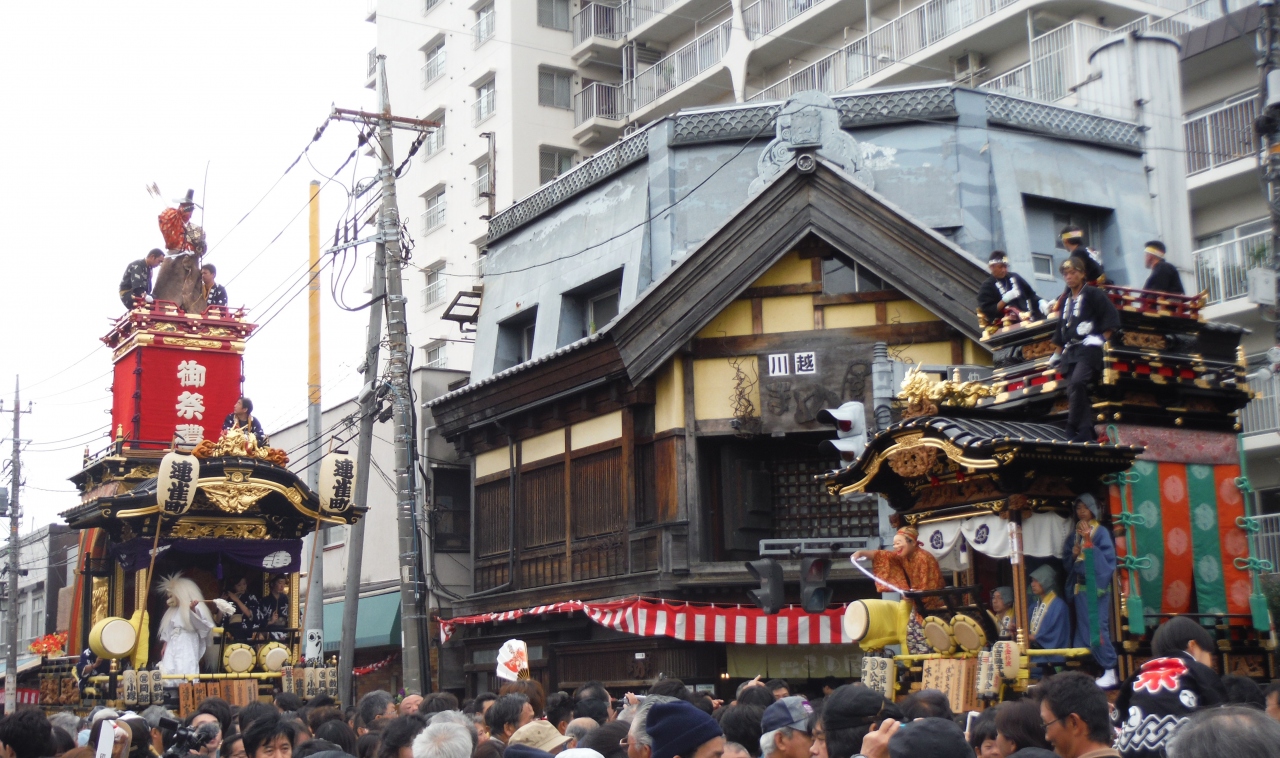 川越の氷川神社の祭礼で、町会ごとの山車が出ます。山車には、太田道灌、徳川家康、徳川家光、日本武尊、猩々などの人形が乗っています。山車に乗った囃子と舞手が祭気分を盛り上げます。