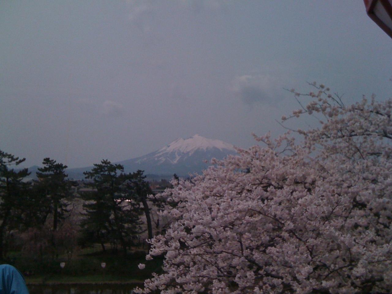 弘前市内、どこにいても岩木山の姿が見えますが、桜の時期に弘前城から見る、桜とのコラボレーションはまさに絶景です。公園の奥の方が有料エリアになっていて、そこの高台からこの景色を見ることができます。