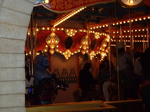 10/19(土)にディズニーシーへ行って来ました。当日は一日中曇りで、夕方から時々小雨が降りましたが、たくさんのアトラクションを楽しむことが出来ました。その中で最後に乗ったのがこのキャラバンカルーセルです。乗り場は1階と2階に分かれていて、2階の方が待ち時間が長かったのですが、20分程だったので2階で待つことにしました。やっぱり2階からの景色の方が素敵かなと思い・・・