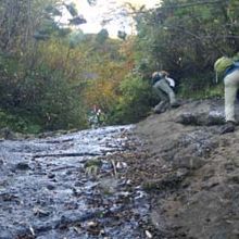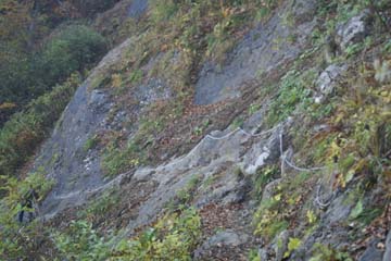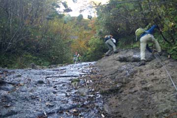 あたりは、紅葉が始まっていて水流に沿ってゴロゴロした岩を下ると、登山道が分かれて沢の左右を渡って下っていくと、滑滝を鎖で下るところで行列が出来ていて、2本ある鎖を交互につかんで下っていきました。
