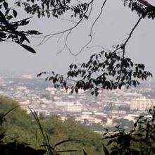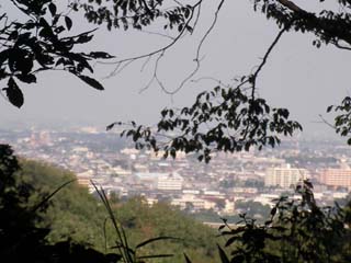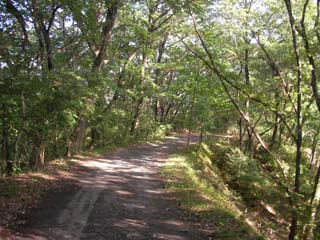 高崎観音からはみやげ物屋の店先を通って、高崎自然歩道に入ります。尾根上の簡易舗装の道で途中で、木の間から高崎市街が見下ろせます。谷を隔てた染料植物園への吊橋のある道が別れ、さらに進むとオリエンテーリングのパーマネントコースのポストがあり、洞窟観音への分岐で階段を下っていきます。