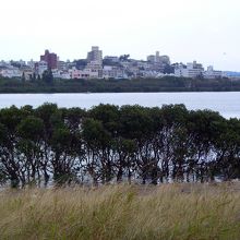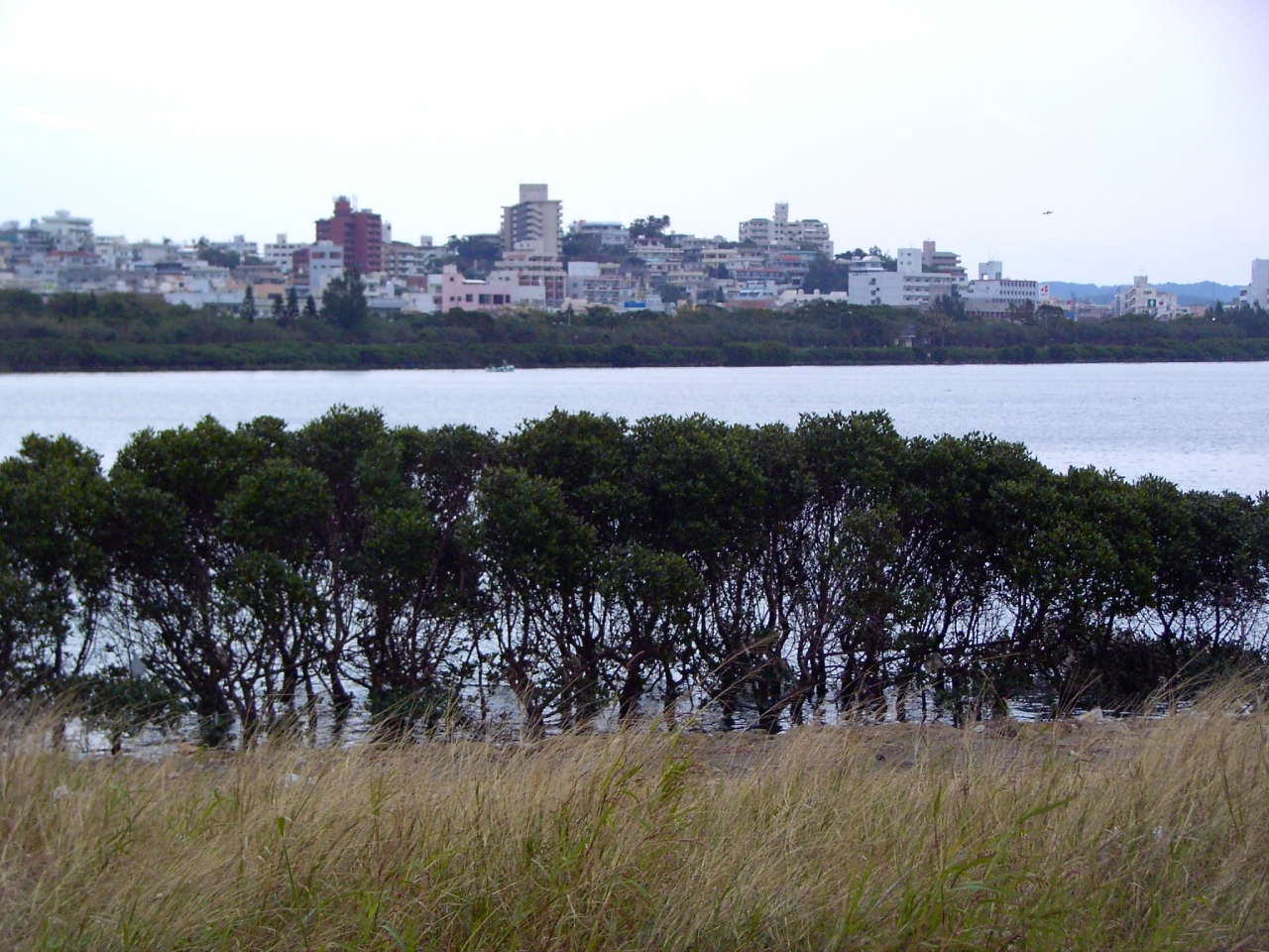 那覇市内を流れる国場川の河口付近の川幅が広くなったところであり、厳密な意味での湖ではありません。水面は海面とほぼ同じ高さで汽水域となっており、世界的に希少なクロツラヘラサギの生息地ともなっています。とはいえ、住宅街の中で流れがよどみ、マングローブにゴミが引っ掛かり、川の上をおもちゃのようなモノレールが走る、あまり「自然保護区域」と言い難いような雰囲気であるのも否めない感がします。人工的に植えたマングローブによって陸地化が進んでいることから再度除去するなど、観光保全のむずかしさを物語っている場でもあります。