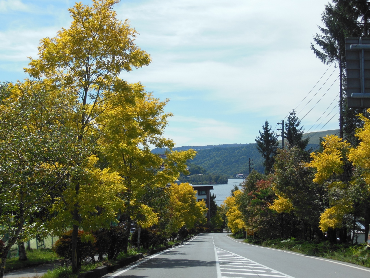 正面に白樺湖が見える道の両側は黄色に色づいたアカシアの木でとても綺麗でした。