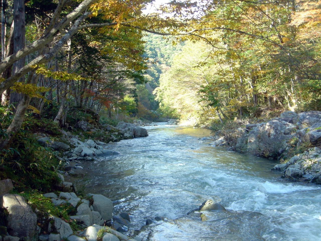 国道156号線を白川郷方面に向けて走る途中にあります。大きな案内板もありますが、立ち寄る人は少なそうです。一歩中に入ると、きれいに整備された森があり、多くの木々の紅葉を楽しむことができます。最もきれいなのが川沿いに並ぶもみじの赤や黄色の風景でしょう。盛りは10月の中頃です。私が訪れた10月下旬はもう遅いようでした。