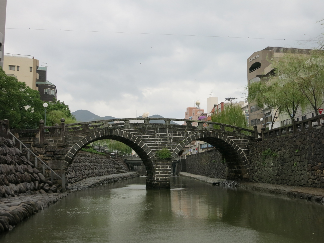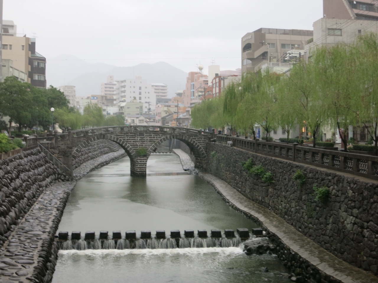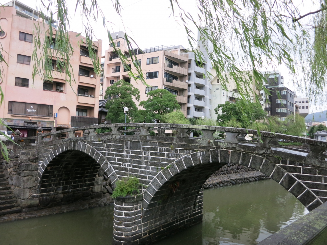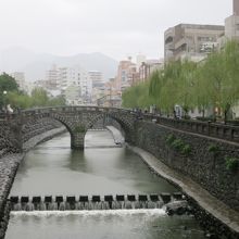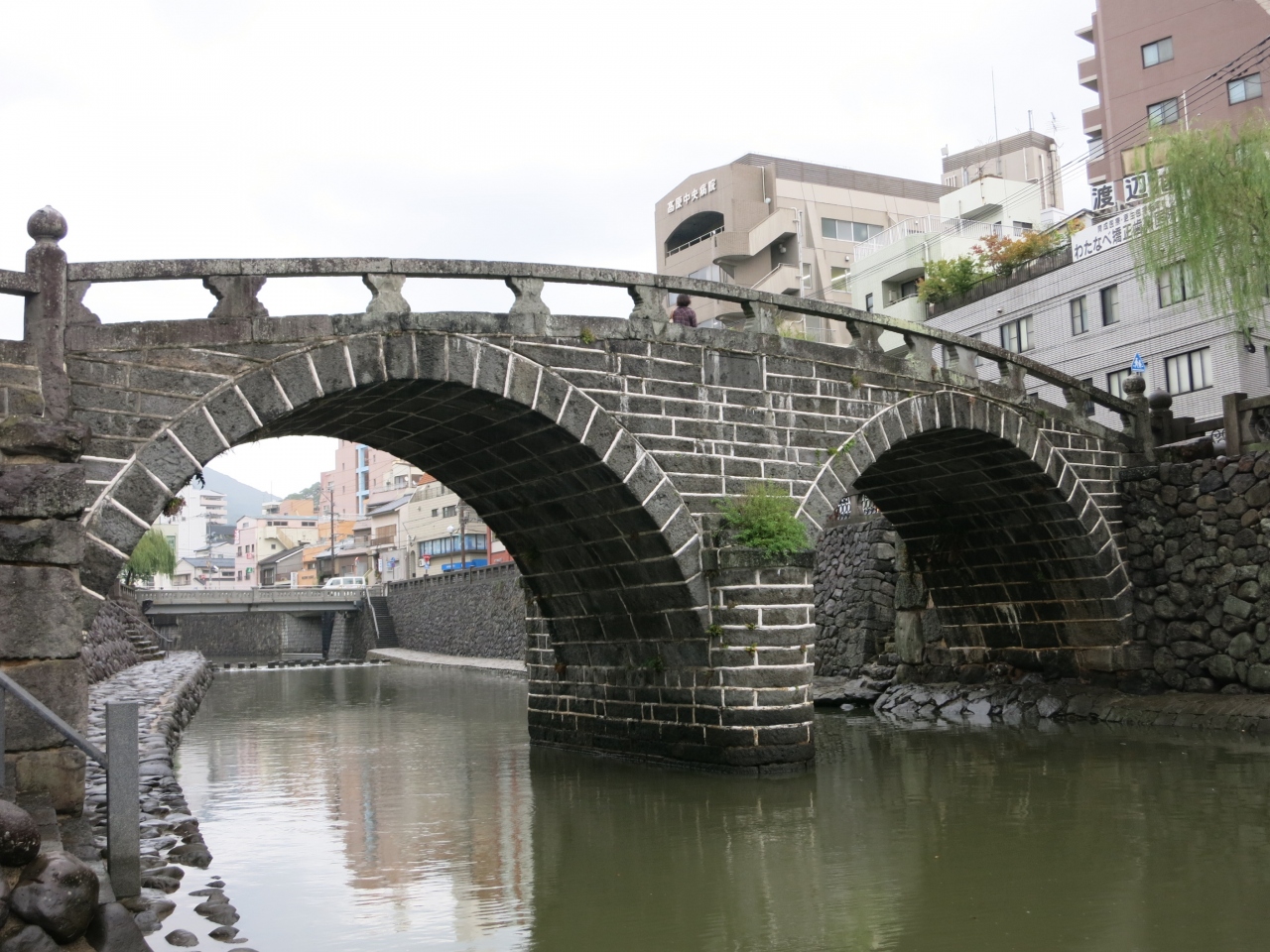 天気が悪く、川面は荒れて眼鏡には見えませんでした。眼鏡橋は相当珍しいのかと思いきや、近くにも同時期に作られた同じような石造りの橋がいくつか架かっていました。平戸の幸橋を見てきた後だったので、同じような雰囲気に目新しさはあまりありませんでした。ただ、橋げたがある二重橋になっているのは、見た中では眼鏡橋だけ。街中を流れる川に柳の並木が植えられ、石橋の眼鏡橋が架かる様子は風情があるのかもしれません。しかし、天気が悪かったのと、周囲は雑居ビルなどが立ち並んでいたため、夜を待たないと見栄えはあがりません。ライトアップされるときれいだと思いました。