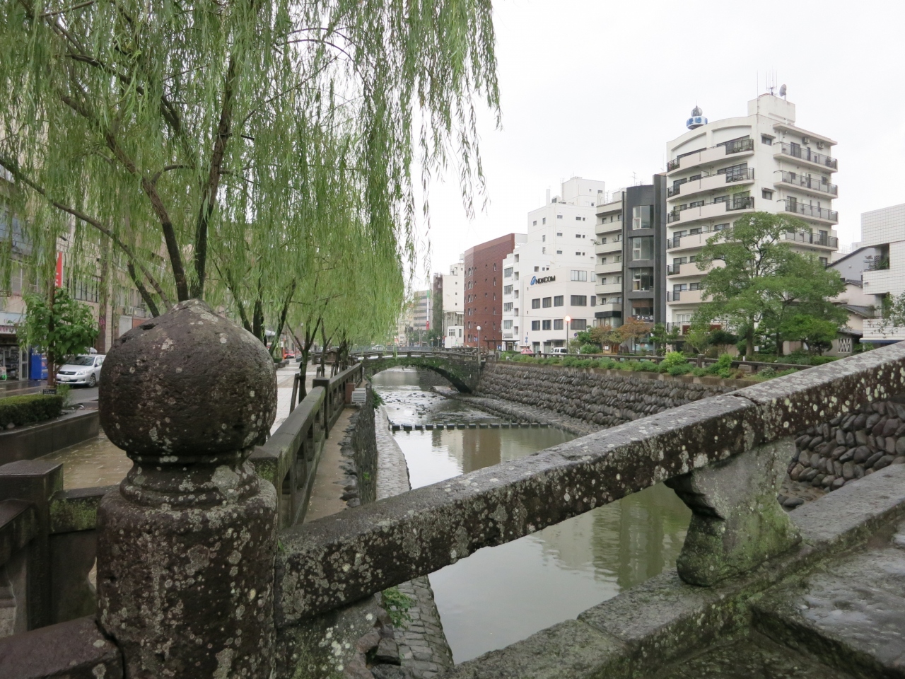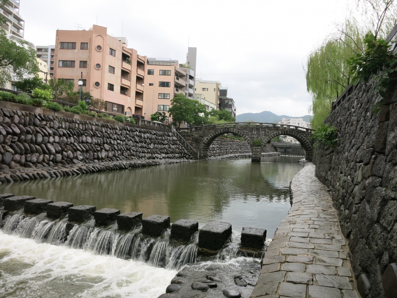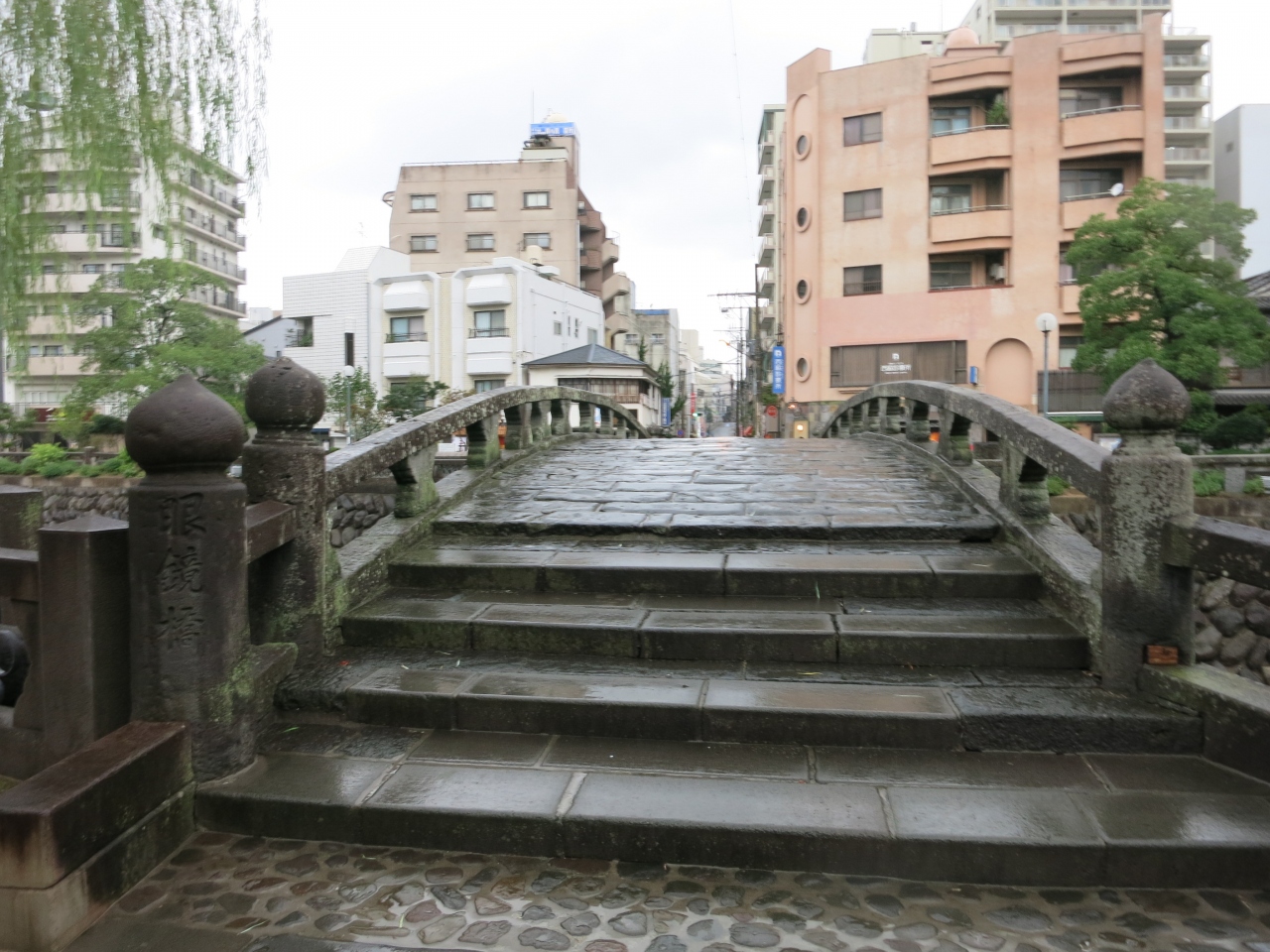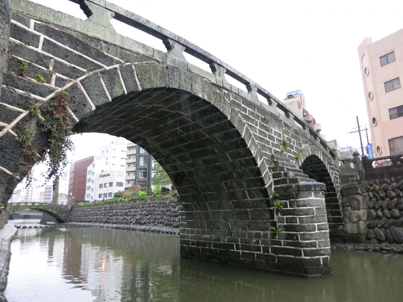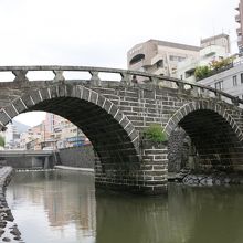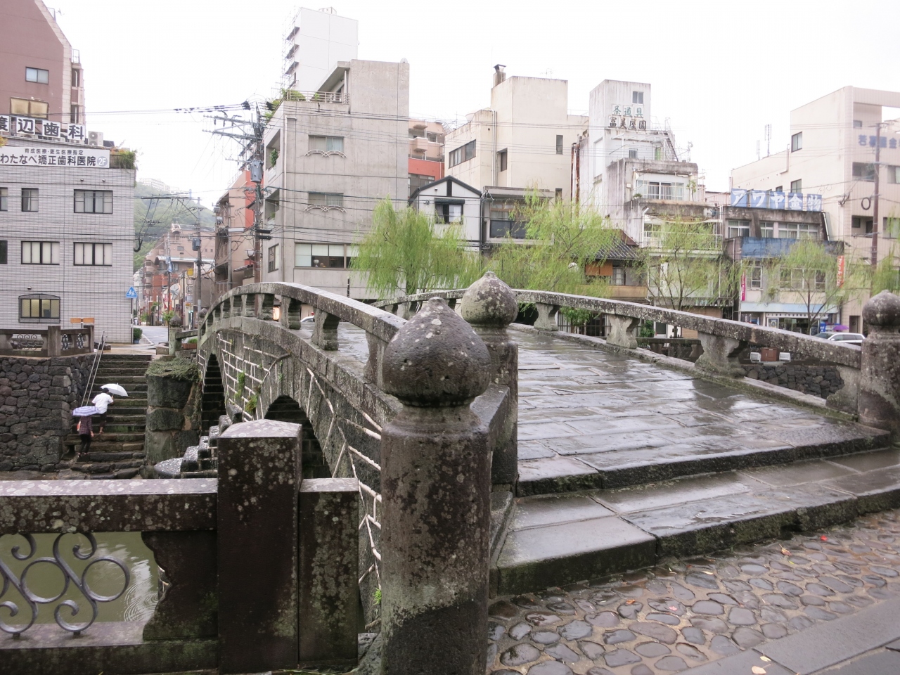 天気が悪く、川面は荒れて眼鏡には見えませんでした。眼鏡橋は相当珍しいのかと思いきや、近くにも同時期に作られた同じような石造りの橋がいくつか架かっていました。平戸の幸橋を見てきた後だったので、同じような雰囲気に目新しさはあまりありませんでした。ただ、橋げたがある二重橋になっているのは、見た中では眼鏡橋だけ。街中を流れる川に柳の並木が植えられ、石橋の眼鏡橋が架かる様子は風情があるのかもしれません。しかし、天気が悪かったのと、周囲は雑居ビルなどが立ち並んでいたため、夜を待たないと見栄えはあがりません。ライトアップされるときれいだと思いました。