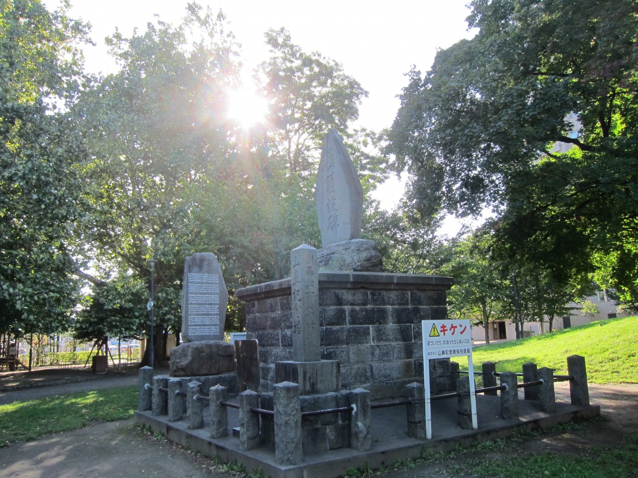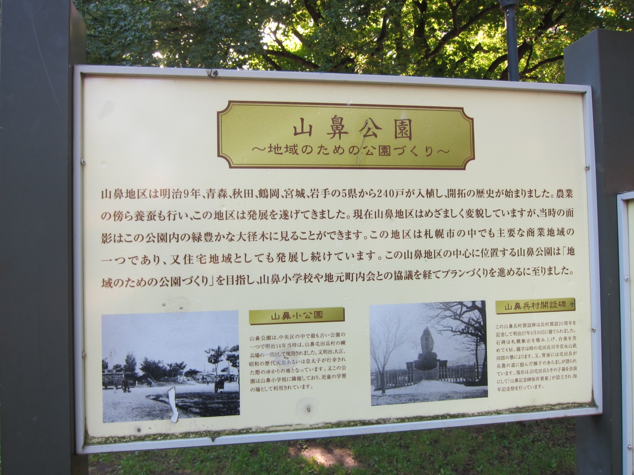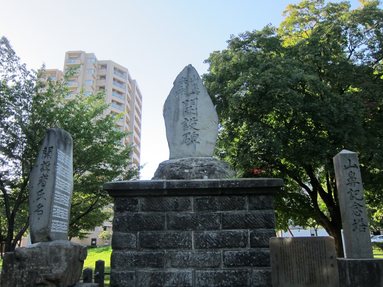 国道230号線、石山通の南14条のあたり、山鼻公園内にある碑です。公園の真ん中にある広場の前にあるのですぐ分かります。今では真夜中も車の通りが頻繁な街中の通り沿いにありますが、説明看板の昔の地図や写真などを見ると、街中の公園のこの同じ石碑が辺鄙な開拓地の一角にあったのが分かります。周囲の商業ビルやマンションなどが建ち、街が変わっていく変遷を見続けてきた碑なのですね。